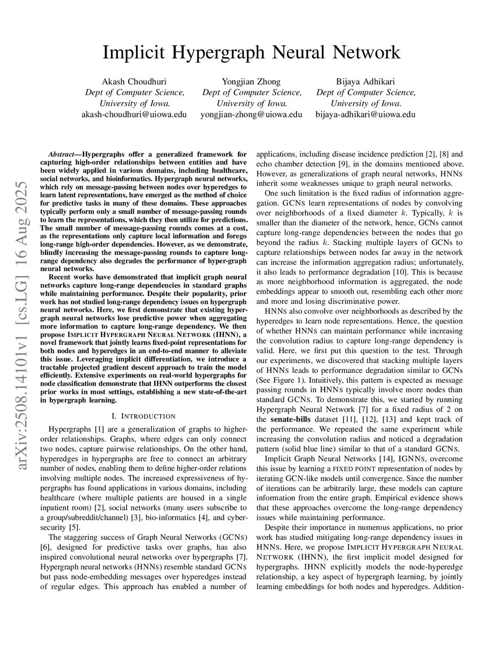 Hypergraphs offer a generalized framework for capturing high-order relationships between entities and have been widely applied in various domains, including healthcare, social networks, and bioinformatics. Hypergraph neural networks, which rely on message-passing between nodes over hyperedges to learn latent representations, have emerged as the method of choice for predictive tasks in many of these domains. These approaches typically perform only a small number of message-passing rounds to learn the representations, which they then utilize for predictions. The small number of message-passing rounds comes at a cost, as the representations only capture local information and forego long-range high-order dependencies. However, as we demonstrate, blindly increasing the message-passing rounds to capture long-range dependency also degrades the performance of hyper-graph neural networks.Recent works have demonstrated that implicit graph neural networks capture long-range dependencies in standard graphs while maintaining performance. Despite their popularity, prior work has not studied long-range dependency issues on hypergraph neural networks. Here, we first demonstrate that existing hypergraph neural networks lose predictive power when aggregating more information to capture long-range dependency. We then propose Implicit Hypergraph Neural Network (IHNN), a novel framework that jointly learns fixed-point representations for both nodes and hyperedges in an end-to-end manner to alleviate this issue. Leveraging implicit differentiation, we introduce a tractable projected gradient descent approach to train the model efficiently. Extensive experiments on real-world hypergraphs for node classification demonstrate that IHNN outperforms the closest prior works in most settings, establishing a new state-of-the-art in hypergraph learning.