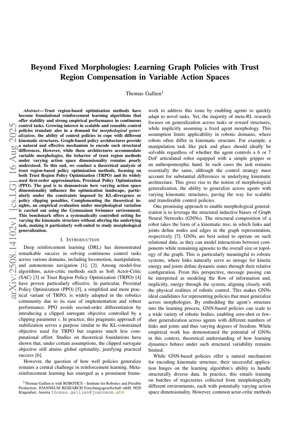 Trust region-based optimization methods have become foundational reinforcement learning algorithms that offer stability and strong empirical performance in continuous control tasks. Growing interest in scalable and reusable control policies translate also in a demand for morphological generalization, the ability of control policies to cope with different kinematic structures. Graph-based policy architectures provide a natural and effective mechanism to encode such structural differences. However, while these architectures accommodate variable morphologies, the behavior of trust region methods under varying action space dimensionality remains poorly understood. To this end, we conduct a theoretical analysis of trust region-based policy optimization methods, focusing on both Trust Region Policy Optimization (TRPO) and its widely used first-order approximation, Proximal Policy Optimization (PPO). The goal is to demonstrate how varying action space dimensionality influence the optimization landscape, particularly under the constraints imposed by KL-divergence or policy clipping penalties. Complementing the theoretical insights, an empirical evaluation under morphological variation is carried out using the Gymnasium Swimmer environment. This benchmark offers a systematically controlled setting for varying the kinematic structure without altering the underlying task, making it particularly well-suited to study morphological generalization.
