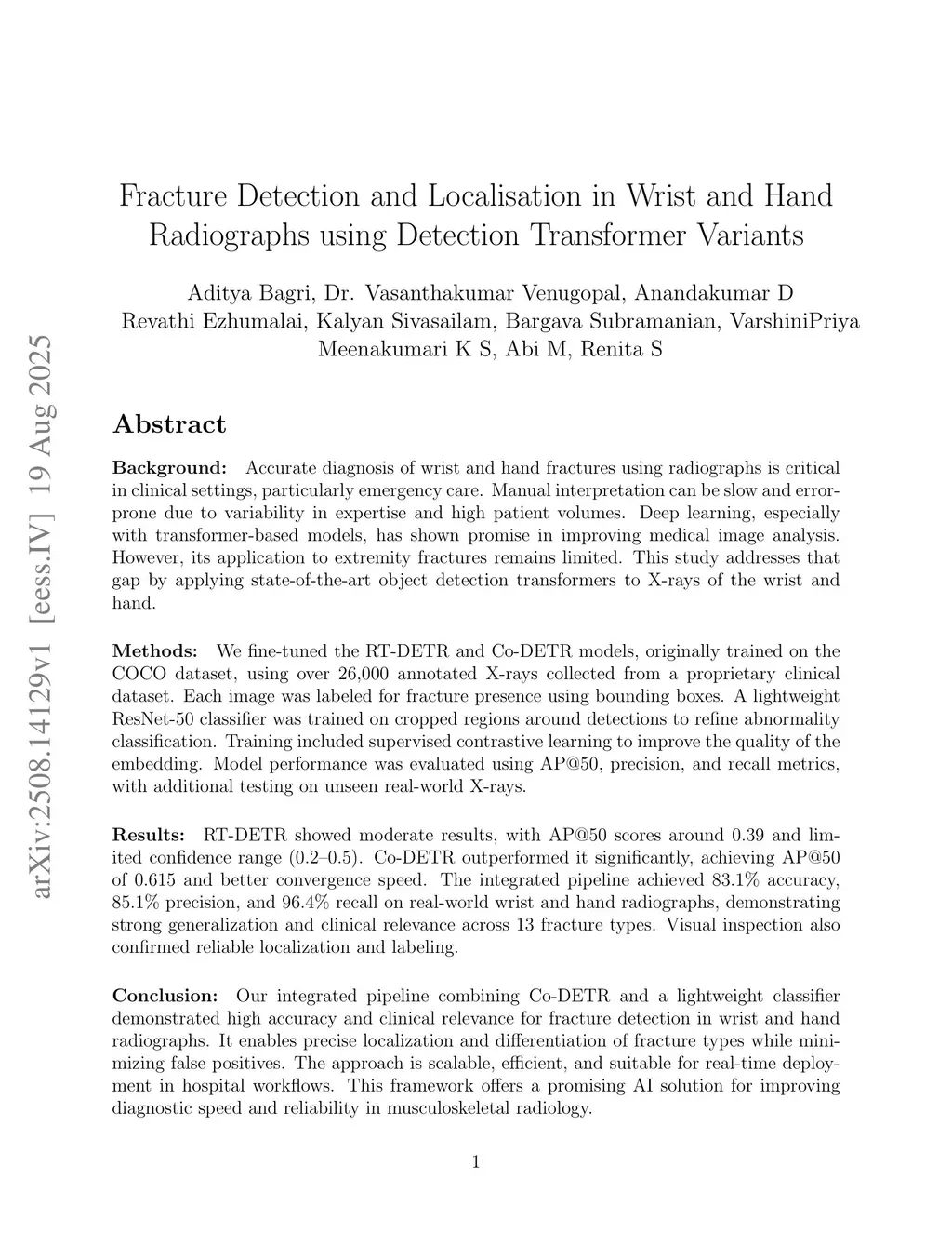 Background: Accurate diagnosis of wrist and hand fractures using radiographs is essential in emergency care, but manual interpretation is slow and prone to errors. Transformer-based models show promise in improving medical image analysis, but their application to extremity fractures is limited. This study addresses this gap by applying object detection transformers to wrist and hand X-rays.Methods: We fine-tuned the RT-DETR and Co-DETR models, pre-trained on COCO, using over 26,000 annotated X-rays from a proprietary clinical dataset. Each image was labeled for fracture presence with bounding boxes. A ResNet-50 classifier was trained on cropped regions to refine abnormality classification. Supervised contrastive learning was used to enhance embedding quality. Performance was evaluated using AP@50, precision, and recall metrics, with additional testing on real-world X-rays.Results: RT-DETR showed moderate results (AP@50 = 0.39), while Co-DETR outperformed it with an AP@50 of 0.615 and faster convergence. The integrated pipeline achieved 83.1% accuracy, 85.1% precision, and 96.4% recall on real-world X-rays, demonstrating strong generalization across 13 fracture types. Visual inspection confirmed accurate localization.Conclusion: Our Co-DETR-based pipeline demonstrated high accuracy and clinical relevance in wrist and hand fracture detection, offering reliable localization and differentiation of fracture types. It is scalable, efficient, and suitable for real-time deployment in hospital workflows, improving diagnostic speed and reliability in musculoskeletal radiology.