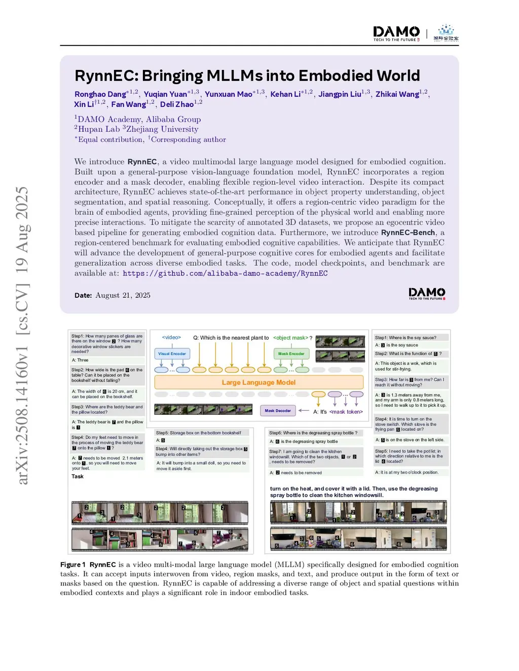 We introduce RynnEC, a video multimodal large language model designed for embodied cognition. Built upon a general-purpose vision-language foundation model, RynnEC incorporates a region encoder and a mask decoder, enabling flexible region-level video interaction. Despite its compact architecture, RynnEC achieves state-of-the-art performance in object property understanding, object segmentation, and spatial reasoning. Conceptually, it offers a region-centric video paradigm for the brain of embodied agents, providing fine-grained perception of the physical world and enabling more precise interactions. To mitigate the scarcity of annotated 3D datasets, we propose an egocentric video based pipeline for generating embodied cognition data. Furthermore, we introduce RynnEC-Bench, a region-centered benchmark for evaluating embodied cognitive capabilities. We anticipate that RynnEC will advance the development of general-purpose cognitive cores for embodied agents and facilitate generalization across diverse embodied tasks. The code, model checkpoints, and benchmark are available at:this https URL