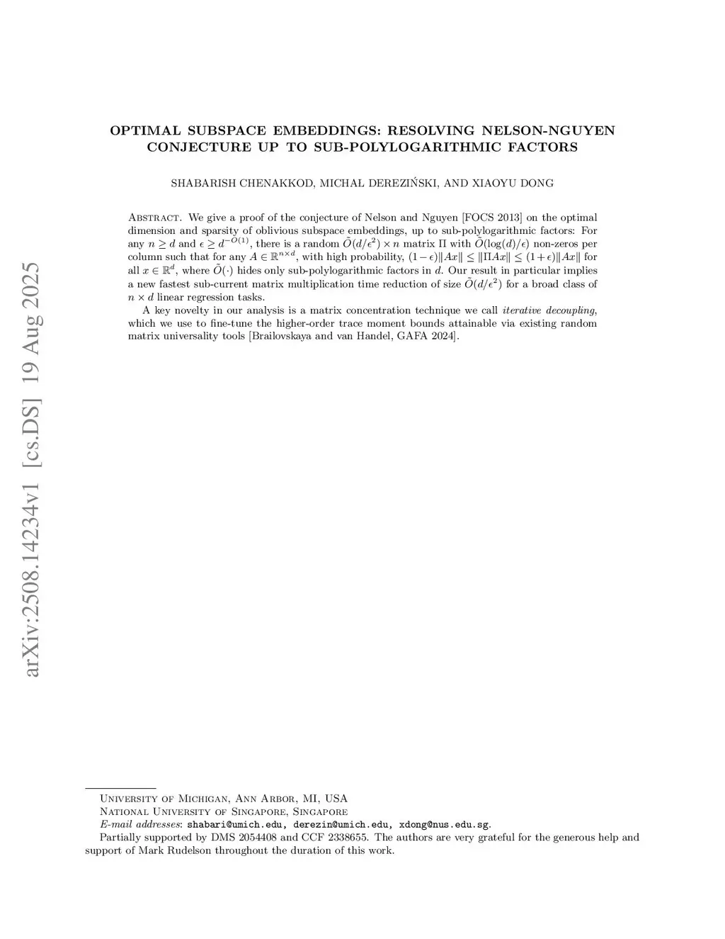 We give a proof of the conjecture of Nelson and Nguyen [FOCS 2013] on the optimal dimension and sparsity of oblivious subspace embeddings, up to sub-polylogarithmic factors: For any and , there is a random matrix with non-zeros per column such that for any , with high probability, for all , where hides only sub-polylogarithmic factors in . Our result in particular implies a new fastest sub-current matrix multiplication time reduction of size for a broad class of linear regression tasks.A key novelty in our analysis is a matrix concentration technique we call iterative decoupling, which we use to fine-tune the higher-order trace moment bounds attainable via existing random matrix universality tools [Brailovskaya and van Handel, GAFA 2024].