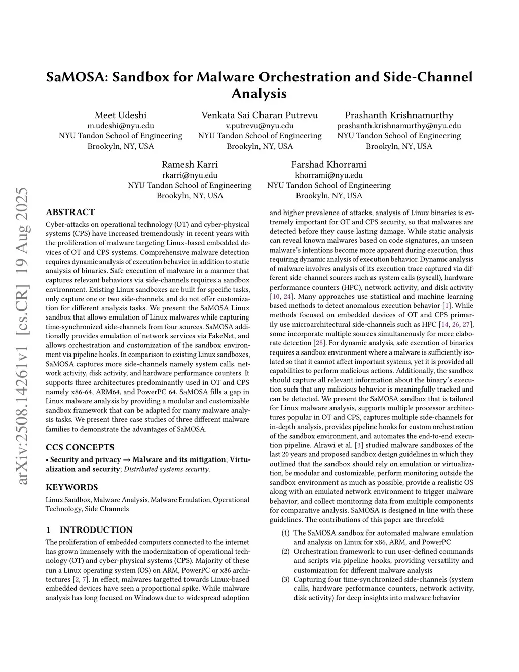 Cyber-attacks on operational technology (OT) and cyber-physical systems (CPS) have increased tremendously in recent years with the proliferation of malware targeting Linux-based embedded devices of OT and CPS systems. Comprehensive malware detection requires dynamic analysis of execution behavior in addition to static analysis of binaries. Safe execution of malware in a manner that captures relevant behaviors via side-channels requires a sandbox environment. Existing Linux sandboxes are built for specific tasks, only capture one or two side-channels, and do not offer customization for different analysis tasks. We present the SaMOSA Linux sandbox that allows emulation of Linux malwares while capturing time-synchronized side-channels from four sources. SaMOSA additionally provides emulation of network services via FakeNet, and allows orchestration and customization of the sandbox environment via pipeline hooks. In comparison to existing Linux sandboxes, SaMOSA captures more side-channels namely system calls, network activity, disk activity, and hardware performance counters. It supports three architectures predominantly used in OT and CPS namely x86-64, ARM64, and PowerPC 64. SaMOSA fills a gap in Linux malware analysis by providing a modular and customizable sandbox framework that can be adapted for many malware analysis tasks. We present three case studies of three different malware families to demonstrate the advantages of SaMOSA.