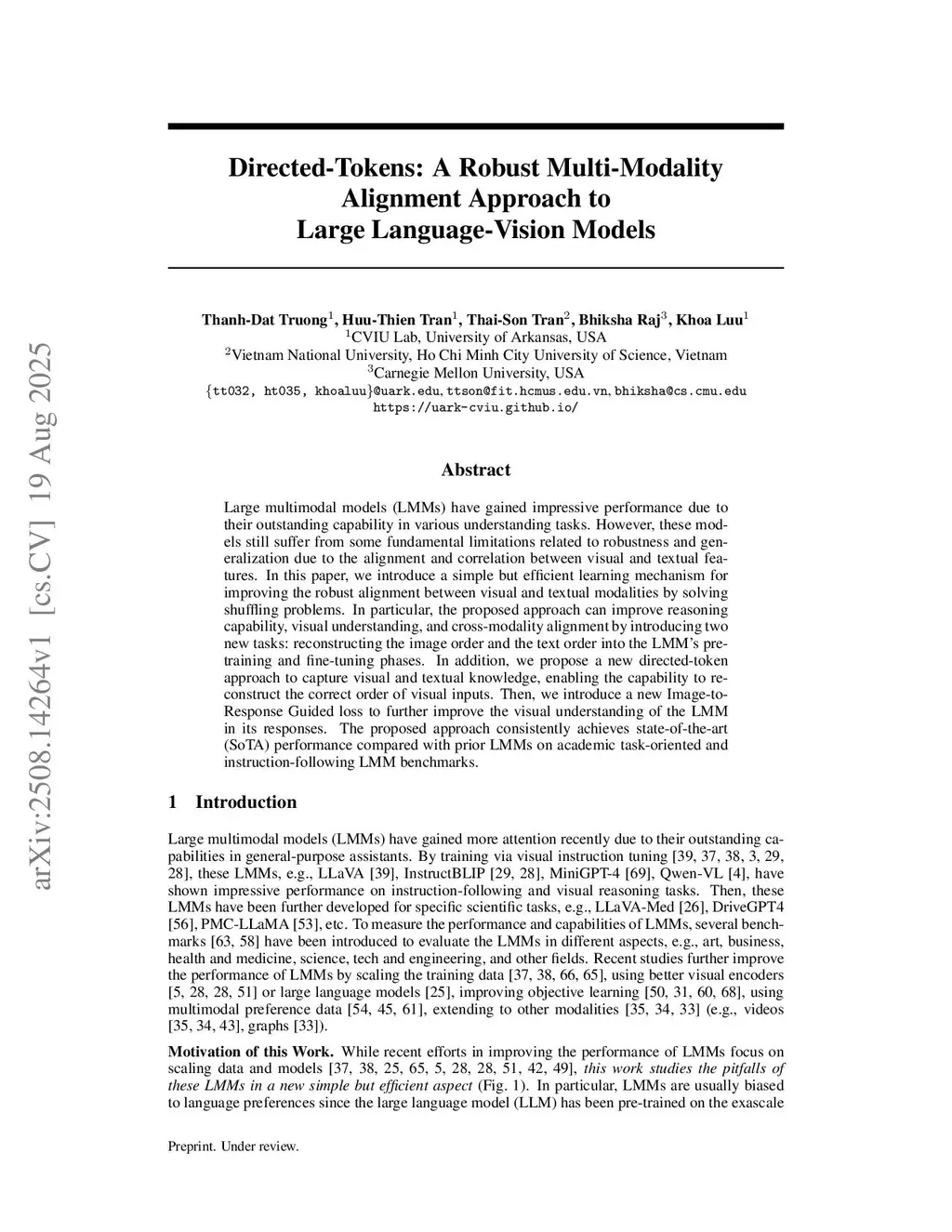 Directed-Tokens: A Robust Multi-Modality Alignment Approach to Large Language-Vision Models