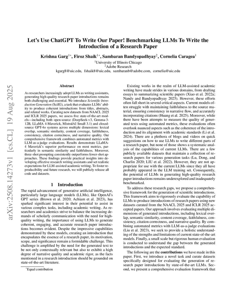 As researchers increasingly adopt LLMs as writing assistants, generating high-quality research paper introductions remains both challenging and essential. We introduce Scientific Introduction Generation (SciIG), a task that evaluates LLMs' ability to produce coherent introductions from titles, abstracts, and related works. Curating new datasets from NAACL 2025 and ICLR 2025 papers, we assess five state-of-the-art models, including both open-source (DeepSeek-v3, Gemma-3-12B, LLaMA 4-Maverick, MistralAI Small 3.1) and closed-source GPT-4o systems, across multiple dimensions: lexical overlap, semantic similarity, content coverage, faithfulness, consistency, citation correctness, and narrative quality. Our comprehensive framework combines automated metrics with LLM-as-a-judge evaluations. Results demonstrate LLaMA-4 Maverick's superior performance on most metrics, particularly in semantic similarity and faithfulness. Moreover, three-shot prompting consistently outperforms fewer-shot approaches. These findings provide practical insights into developing effective research writing assistants and set realistic expectations for LLM-assisted academic writing. To foster reproducibility and future research, we will publicly release all code and datasets.