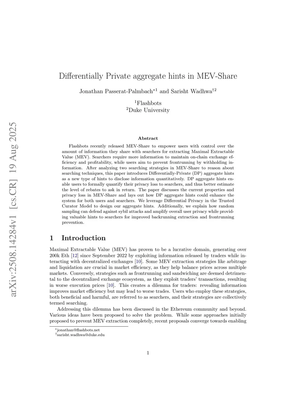 Flashbots recently released mev-share to empower users with control over the amount of information they share with searchers for extracting Maximal Extractable Value (MEV). Searchers require more information to maintain on-chain exchange efficiency and profitability, while users aim to prevent frontrunning by withholding information. After analyzing two searching strategies in mev-share to reason about searching techniques, this paper introduces Differentially-Private (DP) aggregate hints as a new type of hints to disclose information quantitatively. DP aggregate hints enable users to formally quantify their privacy loss to searchers, and thus better estimate the level of rebates to ask in return. The paper discusses the current properties and privacy loss in mev-share and lays out how DP aggregate hints could enhance the system for both users and searchers. We leverage Differential Privacy in the Trusted Curator Model to design our aggregate hints. Additionally, we explain how random sampling can defend against sybil attacks and amplify overall user privacy while providing valuable hints to searchers for improved backrunning extraction and frontrunning prevention.