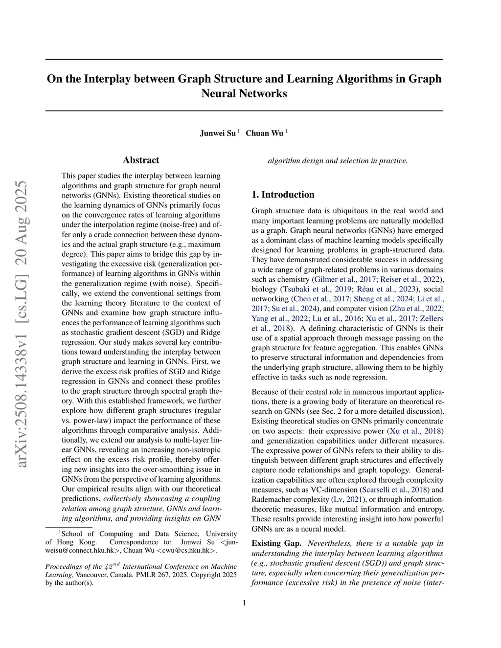 This paper studies the interplay between learning algorithms and graph structure for graph neural networks (GNNs). Existing theoretical studies on the learning dynamics of GNNs primarily focus on the convergence rates of learning algorithms under the interpolation regime (noise-free) and offer only a crude connection between these dynamics and the actual graph structure (e.g., maximum degree). This paper aims to bridge this gap by investigating the excessive risk (generalization performance) of learning algorithms in GNNs within the generalization regime (with noise). Specifically, we extend the conventional settings from the learning theory literature to the context of GNNs and examine how graph structure influences the performance of learning algorithms such as stochastic gradient descent (SGD) and Ridge regression. Our study makes several key contributions toward understanding the interplay between graph structure and learning in GNNs. First, we derive the excess risk profiles of SGD and Ridge regression in GNNs and connect these profiles to the graph structure through spectral graph theory. With this established framework, we further explore how different graph structures (regular vs. power-law) impact the performance of these algorithms through comparative analysis. Additionally, we extend our analysis to multi-layer linear GNNs, revealing an increasing non-isotropic effect on the excess risk profile, thereby offering new insights into the over-smoothing issue in GNNs from the perspective of learning algorithms. Our empirical results align with our theoretical predictions, \emph{collectively showcasing a coupling relation among graph structure, GNNs and learning algorithms, and providing insights on GNN algorithm design and selection in practice.}