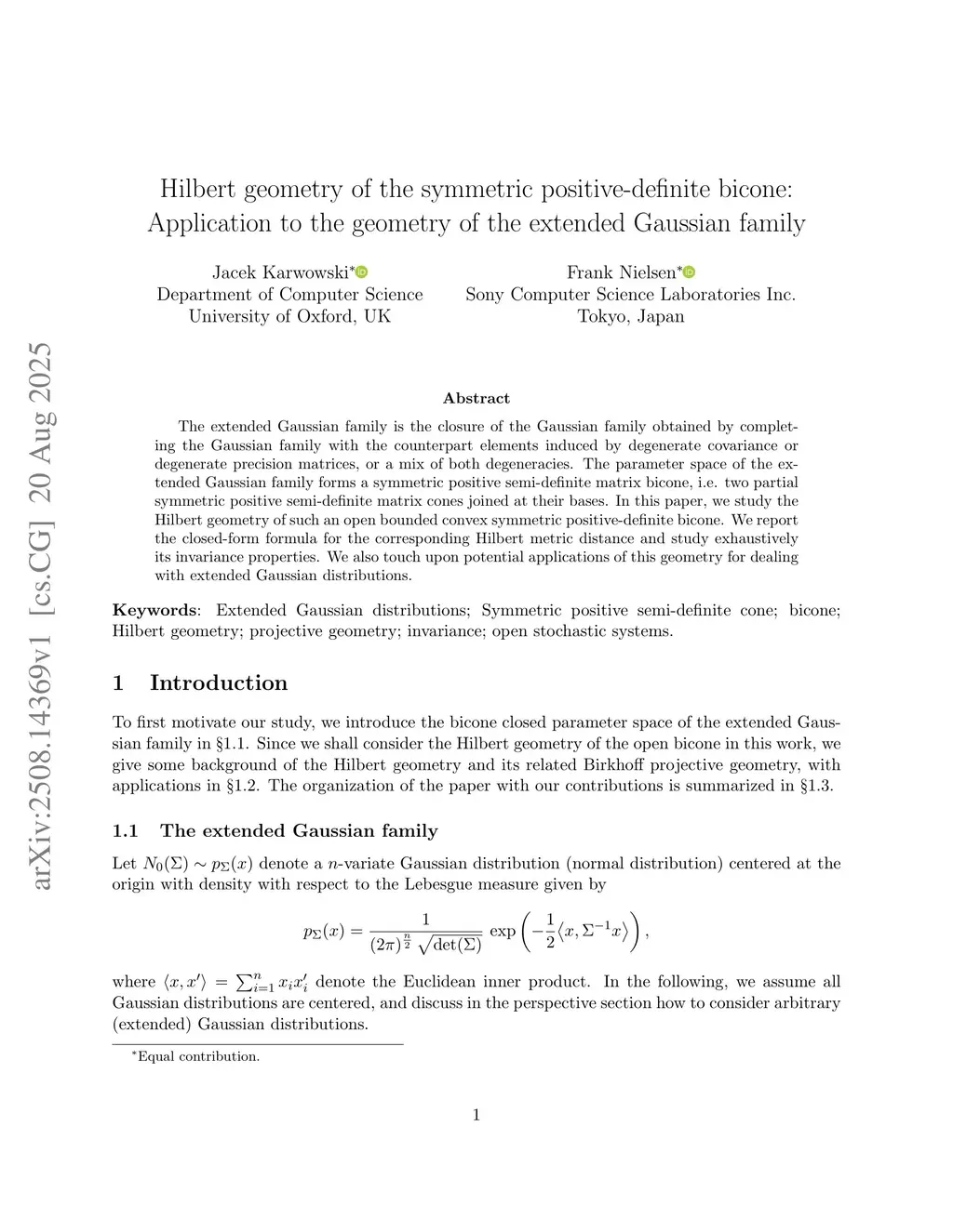 Hilbert geometry of the symmetric positive-definite bicone: Application to the geometry of the extended Gaussian family