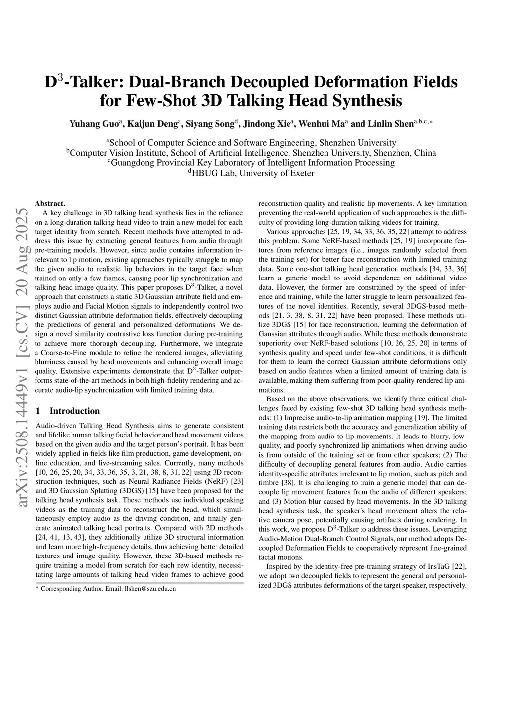 A key challenge in 3D talking head synthesis lies in the reliance on a long-duration talking head video to train a new model for each target identity from scratch. Recent methods have attempted to address this issue by extracting general features from audio through pre-training models. However, since audio contains information irrelevant to lip motion, existing approaches typically struggle to map the given audio to realistic lip behaviors in the target face when trained on only a few frames, causing poor lip synchronization and talking head image quality. This paper proposes D^3-Talker, a novel approach that constructs a static 3D Gaussian attribute field and employs audio and Facial Motion signals to independently control two distinct Gaussian attribute deformation fields, effectively decoupling the predictions of general and personalized deformations. We design a novel similarity contrastive loss function during pre-training to achieve more thorough decoupling. Furthermore, we integrate a Coarse-to-Fine module to refine the rendered images, alleviating blurriness caused by head movements and enhancing overall image quality. Extensive experiments demonstrate that D^3-Talker outperforms state-of-the-art methods in both high-fidelity rendering and accurate audio-lip synchronization with limited training data. Our code will be provided upon acceptance.