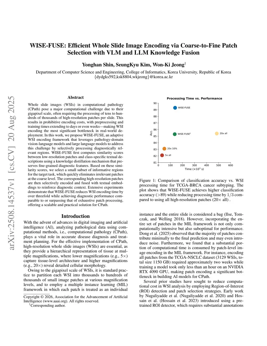 Whole slide images (WSIs) in computational pathology (CPath) pose a major computational challenge due to their gigapixel scale, often requiring the processing of tens to hundreds of thousands of high-resolution patches per slide. This results in prohibitive encoding costs, with preprocessing and training times extending to days or even weeks-making WSI encoding the most significant bottleneck in real-world deployment. In this work, we propose WISE-FUSE, an adaptive WSI encoding framework that leverages pathology-domain vision-language models and large language models to address this challenge by selectively processing diagnostically relevant regions. WISE-FUSE first computes similarity scores between low-resolution patches and class-specific textual descriptions using a knowledge distillation mechanism that preserves fine-grained diagnostic features. Based on these similarity scores, we select a small subset of informative regions for the target task, which quickly eliminates irrelevant patches at the coarse level. The corresponding high-resolution patches are then selectively encoded and fused with textual embeddings to reinforce diagnostic context. Extensive experiments demonstrate that WISE-FUSE reduces WSI encoding time by over threefold while achieving diagnostic performance comparable to or surpassing that of exhaustive patch processing, offering a scalable and practical solution for CPath.