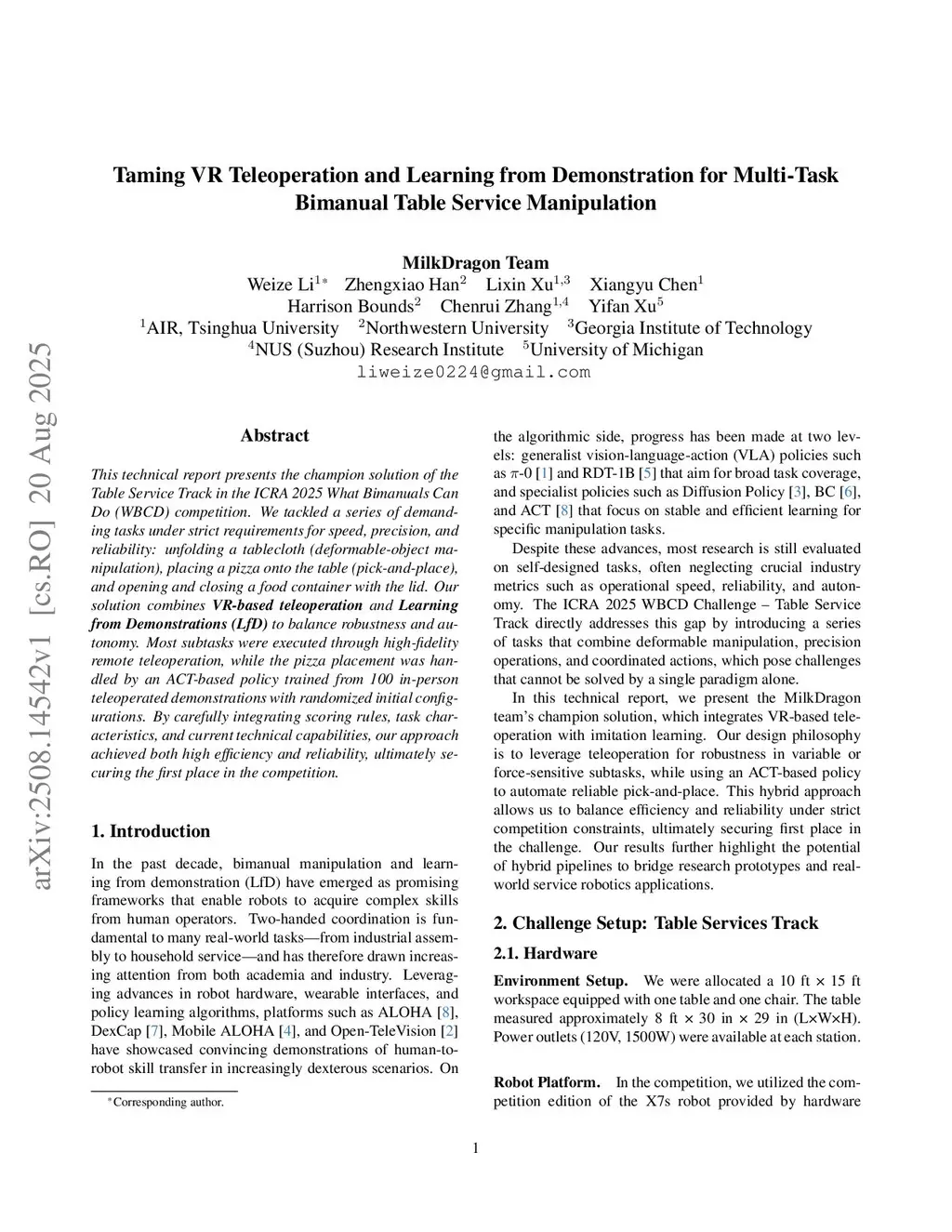 This technical report presents the champion solution of the Table Service Track in the ICRA 2025 What Bimanuals Can Do (WBCD) competition. We tackled a series of demanding tasks under strict requirements for speed, precision, and reliability: unfolding a tablecloth (deformable-object manipulation), placing a pizza into the container (pick-and-place), and opening and closing a food container with the lid. Our solution combines VR-based teleoperation and Learning from Demonstrations (LfD) to balance robustness and autonomy. Most subtasks were executed through high-fidelity remote teleoperation, while the pizza placement was handled by an ACT-based policy trained from 100 in-person teleoperated demonstrations with randomized initial configurations. By carefully integrating scoring rules, task characteristics, and current technical capabilities, our approach achieved both high efficiency and reliability, ultimately securing the first place in the competition.