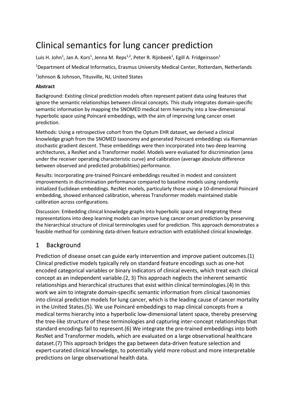 Background: Existing clinical prediction models often represent patient data using features that ignore the semantic relationships between clinical concepts. This study integrates domain-specific semantic information by mapping the SNOMED medical term hierarchy into a low-dimensional hyperbolic space using Poincaré embeddings, with the aim of improving lung cancer onset prediction.Methods: Using a retrospective cohort from the Optum EHR dataset, we derived a clinical knowledge graph from the SNOMED taxonomy and generated Poincaré embeddings via Riemannian stochastic gradient descent. These embeddings were then incorporated into two deep learning architectures, a ResNet and a Transformer model. Models were evaluated for discrimination (area under the receiver operating characteristic curve) and calibration (average absolute difference between observed and predicted probabilities) performance.Results: Incorporating pre-trained Poincaré embeddings resulted in modest and consistent improvements in discrimination performance compared to baseline models using randomly initialized Euclidean embeddings. ResNet models, particularly those using a 10-dimensional Poincaré embedding, showed enhanced calibration, whereas Transformer models maintained stable calibration across configurations.Discussion: Embedding clinical knowledge graphs into hyperbolic space and integrating these representations into deep learning models can improve lung cancer onset prediction by preserving the hierarchical structure of clinical terminologies used for prediction. This approach demonstrates a feasible method for combining data-driven feature extraction with established clinical knowledge.