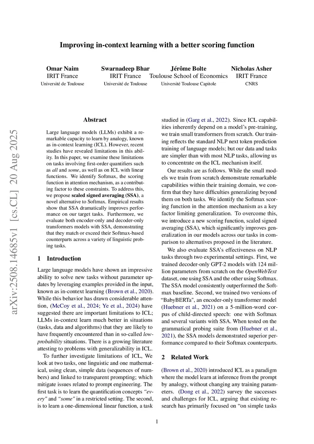 While Large Language models' abilities for in-context learning (ICL) have had much success, they have limitations on simple semantic tasks involving quantifiers like {\em every} and {\em some}, as well as on tasks with linear functions. We analyze those limitations and identify Softmax, the scoring function in the attention mechanism, as a contributing factor to these limitations. Our \textbf{scaled signed averaging (SSA)}, a novel scoring function mitigates these limitations. SSA significantly improves performance on our ICL tasks. In addition, SSA outperforms transformer models with Softmax on several early learning NLP benchmarks and linguistic probing tasks on zero and few-shot settings.