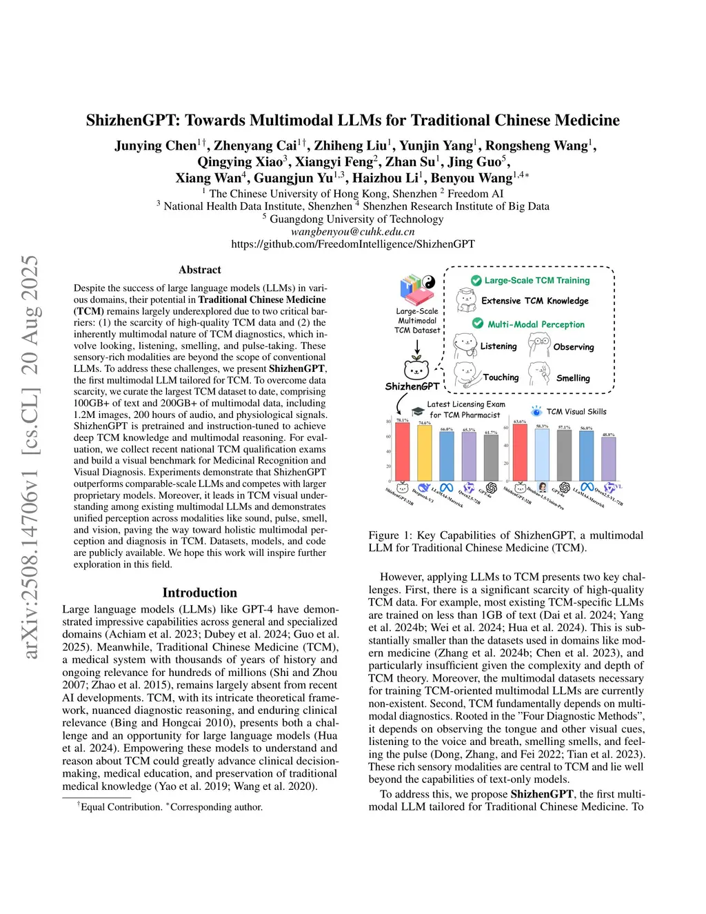 Despite the success of large language models (LLMs) in various domains, their potential in Traditional Chinese Medicine (TCM) remains largely underexplored due to two critical barriers: (1) the scarcity of high-quality TCM data and (2) the inherently multimodal nature of TCM diagnostics, which involve looking, listening, smelling, and pulse-taking. These sensory-rich modalities are beyond the scope of conventional LLMs. To address these challenges, we present ShizhenGPT, the first multimodal LLM tailored for TCM. To overcome data scarcity, we curate the largest TCM dataset to date, comprising 100GB+ of text and 200GB+ of multimodal data, including 1.2M images, 200 hours of audio, and physiological signals. ShizhenGPT is pretrained and instruction-tuned to achieve deep TCM knowledge and multimodal reasoning. For evaluation, we collect recent national TCM qualification exams and build a visual benchmark for Medicinal Recognition and Visual Diagnosis. Experiments demonstrate that ShizhenGPT outperforms comparable-scale LLMs and competes with larger proprietary models. Moreover, it leads in TCM visual understanding among existing multimodal LLMs and demonstrates unified perception across modalities like sound, pulse, smell, and vision, paving the way toward holistic multimodal perception and diagnosis in TCM. Datasets, models, and code are publicly available. We hope this work will inspire further exploration in this field.
