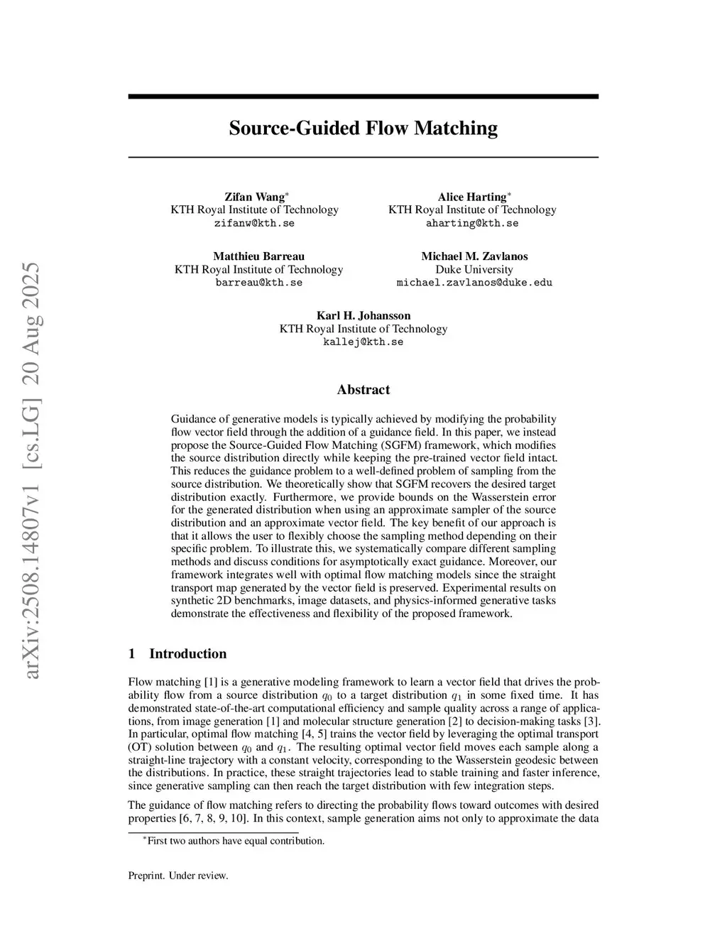 Guidance of generative models is typically achieved by modifying the probability flow vector field through the addition of a guidance field. In this paper, we instead propose the Source-Guided Flow Matching (SGFM) framework, which modifies the source distribution directly while keeping the pre-trained vector field intact. This reduces the guidance problem to a well-defined problem of sampling from the source distribution. We theoretically show that SGFM recovers the desired target distribution exactly. Furthermore, we provide bounds on the Wasserstein error for the generated distribution when using an approximate sampler of the source distribution and an approximate vector field. The key benefit of our approach is that it allows the user to flexibly choose the sampling method depending on their specific problem. To illustrate this, we systematically compare different sampling methods and discuss conditions for asymptotically exact guidance. Moreover, our framework integrates well with optimal flow matching models since the straight transport map generated by the vector field is preserved. Experimental results on synthetic 2D benchmarks, physics-informed generative tasks, and imaging inverse problems demonstrate the effectiveness and flexibility of the proposed framework.