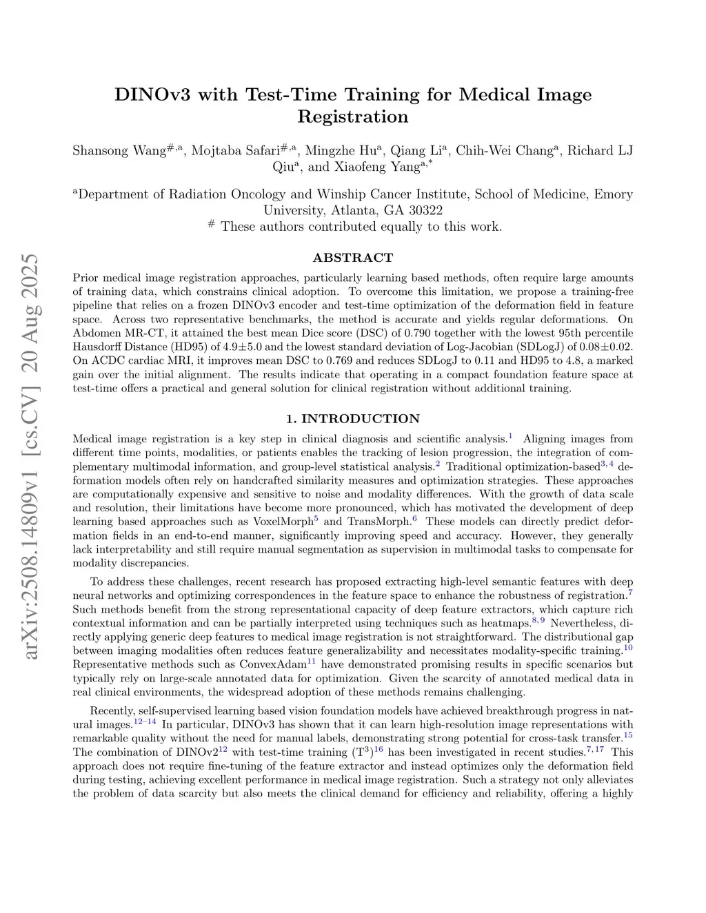Prior medical image registration approaches, particularly learning-based methods, often require large amounts of training data, which constrains clinical adoption. To overcome this limitation, we propose a training-free pipeline that relies on a frozen DINOv3 encoder and test-time optimization of the deformation field in feature space. Across two representative benchmarks, the method is accurate and yields regular deformations. On Abdomen MR-CT, it attained the best mean Dice score (DSC) of 0.790 together with the lowest 95th percentile Hausdorff Distance (HD95) of 4.9+-5.0 and the lowest standard deviation of Log-Jacobian (SDLogJ) of 0.08+-0.02. On ACDC cardiac MRI, it improves mean DSC to 0.769 and reduces SDLogJ to 0.11 and HD95 to 4.8, a marked gain over the initial alignment. The results indicate that operating in a compact foundation feature space at test time offers a practical and general solution for clinical registration without additional training.