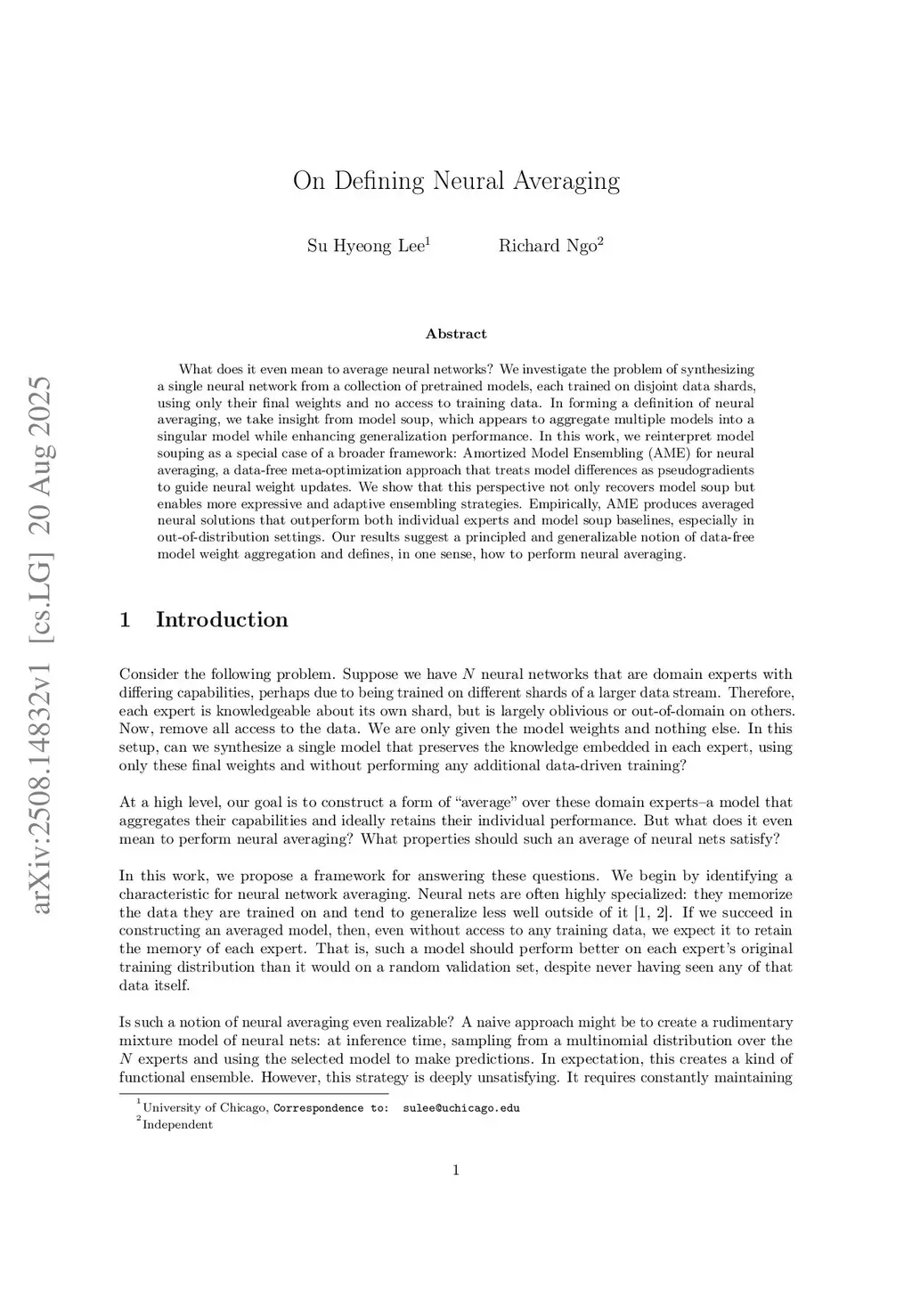 What does it even mean to average neural networks? We investigate the problem of synthesizing a single neural network from a collection of pretrained models, each trained on disjoint data shards, using only their final weights and no access to training data. In forming a definition of neural averaging, we take insight from model soup, which appears to aggregate multiple models into a singular model while enhancing generalization performance. In this work, we reinterpret model souping as a special case of a broader framework: Amortized Model Ensembling (AME) for neural averaging, a data-free meta-optimization approach that treats model differences as pseudogradients to guide neural weight updates. We show that this perspective not only recovers model soup but enables more expressive and adaptive ensembling strategies. Empirically, AME produces averaged neural solutions that outperform both individual experts and model soup baselines, especially in out-of-distribution settings. Our results suggest a principled and generalizable notion of data-free model weight aggregation and defines, in one sense, how to perform neural averaging.