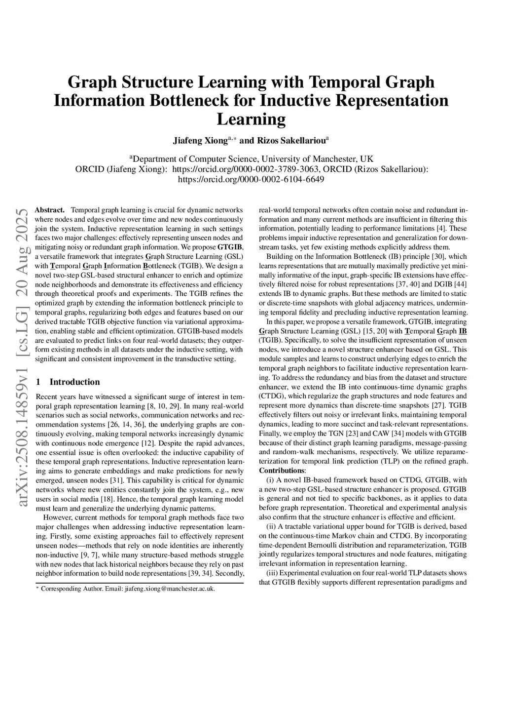 Temporal graph learning is crucial for dynamic networks where nodes and edges evolve over time and new nodes continuously join the system. Inductive representation learning in such settings faces two major challenges: effectively representing unseen nodes and mitigating noisy or redundant graph information. We propose GTGIB, a versatile framework that integrates Graph Structure Learning (GSL) with Temporal Graph Information Bottleneck (TGIB). We design a novel two-step GSL-based structural enhancer to enrich and optimize node neighborhoods and demonstrate its effectiveness and efficiency through theoretical proofs and experiments. The TGIB refines the optimized graph by extending the information bottleneck principle to temporal graphs, regularizing both edges and features based on our derived tractable TGIB objective function via variational approximation, enabling stable and efficient optimization. GTGIB-based models are evaluated to predict links on four real-world datasets; they outperform existing methods in all datasets under the inductive setting, with significant and consistent improvement in the transductive setting.