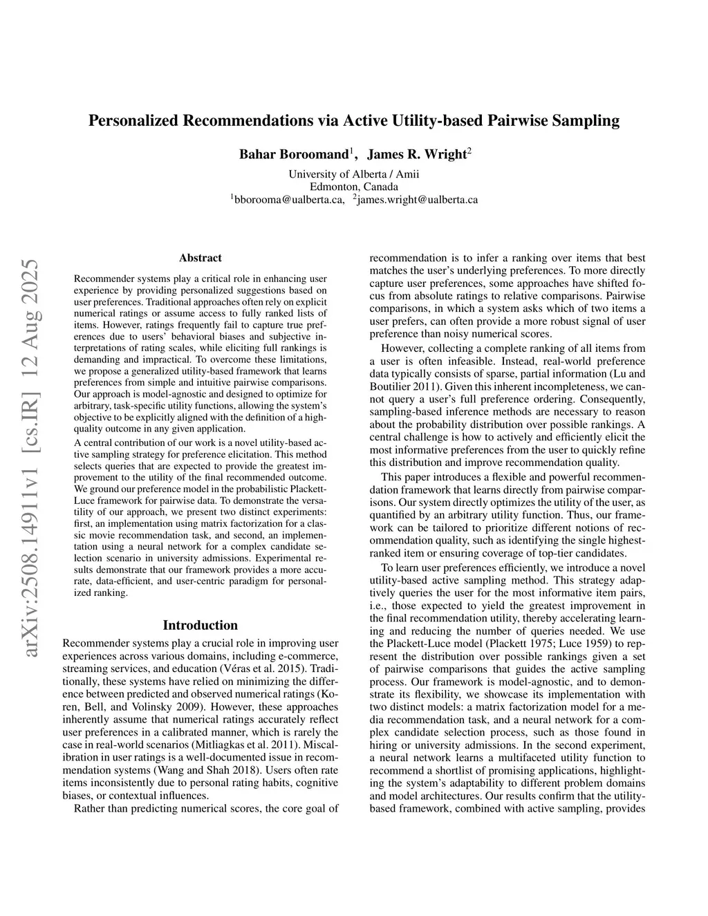 Recommender systems play a critical role in enhancing user experience by providing personalized suggestions based on user preferences. Traditional approaches often rely on explicit numerical ratings or assume access to fully ranked lists of items. However, ratings frequently fail to capture true preferences due to users' behavioral biases and subjective interpretations of rating scales, while eliciting full rankings is demanding and impractical. To overcome these limitations, we propose a generalized utility-based framework that learns preferences from simple and intuitive pairwise comparisons. Our approach is model-agnostic and designed to optimize for arbitrary, task-specific utility functions, allowing the system's objective to be explicitly aligned with the definition of a high-quality outcome in any given application. A central contribution of our work is a novel utility-based active sampling strategy for preference elicitation. This method selects queries that are expected to provide the greatest improvement to the utility of the final recommended outcome. We ground our preference model in the probabilistic Plackett-Luce framework for pairwise data. To demonstrate the versatility of our approach, we present two distinct experiments: first, an implementation using matrix factorization for a classic movie recommendation task, and second, an implementation using a neural network for a complex candidate selection scenario in university admissions. Experimental results demonstrate that our framework provides a more accurate, data-efficient, and user-centric paradigm for personalized ranking.