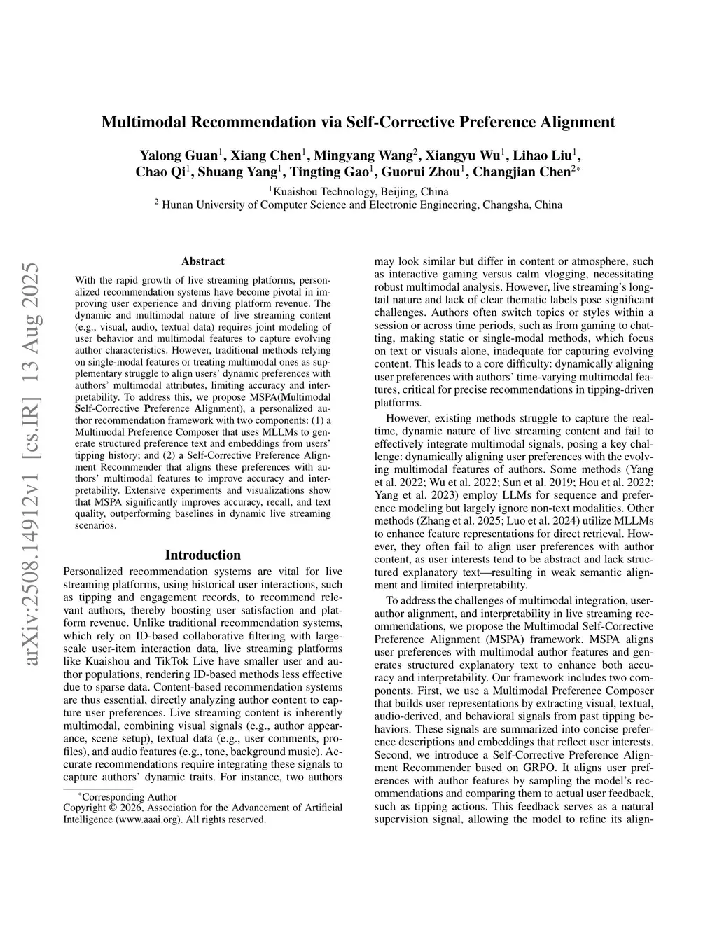 With the rapid growth of live streaming platforms, personalized recommendation systems have become pivotal in improving user experience and driving platform revenue. The dynamic and multimodal nature of live streaming content (e.g., visual, audio, textual data) requires joint modeling of user behavior and multimodal features to capture evolving author characteristics. However, traditional methods relying on single-modal features or treating multimodal ones as supplementary struggle to align users' dynamic preferences with authors' multimodal attributes, limiting accuracy and interpretability. To address this, we propose MSPA (Multimodal Self-Corrective Preference Alignment), a personalized author recommendation framework with two components: (1) a Multimodal Preference Composer that uses MLLMs to generate structured preference text and embeddings from users' tipping history; and (2) a Self-Corrective Preference Alignment Recommender that aligns these preferences with authors' multimodal features to improve accuracy and interpretability. Extensive experiments and visualizations show that MSPA significantly improves accuracy, recall, and text quality, outperforming baselines in dynamic live streaming scenarios.