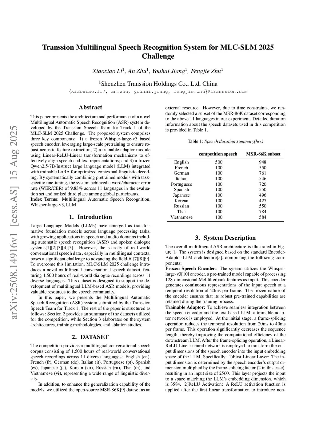 This paper presents the architecture and performance of a novel Multilingual Automatic Speech Recognition (ASR) system developed by the Transsion Speech Team for Track 1 of the MLC-SLM 2025 Challenge. The proposed system comprises three key components: 1) a frozen Whisper-large-v3 based speech encoder, leveraging large-scale pretraining to ensure robust acoustic feature extraction; 2) a trainable adaptor module using Linear-ReLU-Linear transformation mechanisms to effectively align speech and text representations; and 3) a frozen Qwen2.5-7B-Instruct large language model (LLM) integrated with trainable LoRA for optimized contextual linguistic decoding. By systematically combining pretrained models with task specific fine-tuning, the system achieved a word/character error rate (WER/CER) of 9.83% across 11 languages in the evaluation set and ranked third place among global participants.