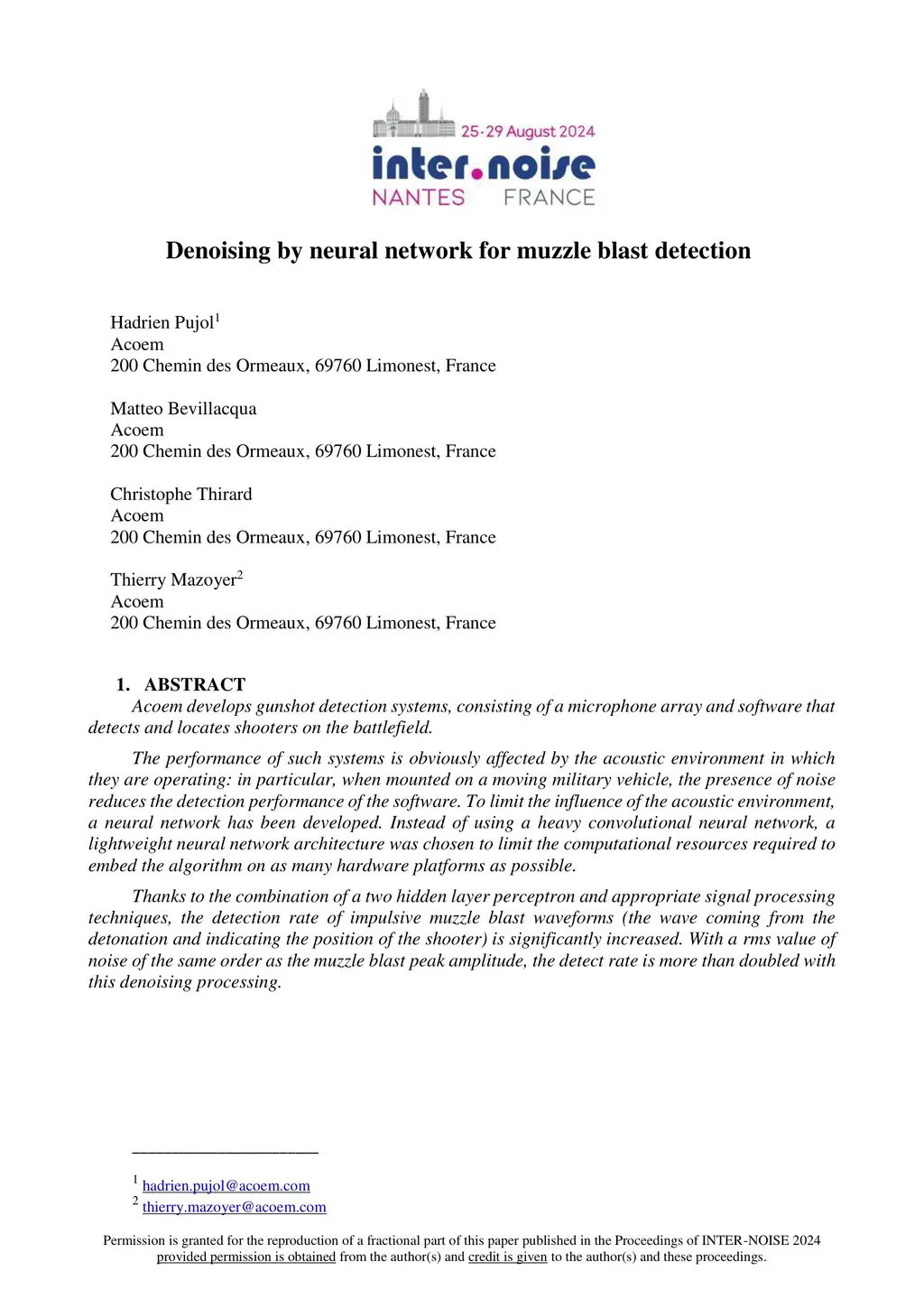 Acoem develops gunshot detection systems, consisting of a microphone array and software that detects and locates shooters on the battlefield. The performance of such systems is obviously affected by the acoustic environment in which they are operating: in particular, when mounted on a moving military vehicle, the presence of noise reduces the detection performance of the software. To limit the influence of the acoustic environment, a neural network has been developed. Instead of using a heavy convolutional neural network, a lightweight neural network architecture was chosen to limit the computational resources required to embed the algorithm on as many hardware platforms as possible. Thanks to the combination of a two hidden layer perceptron and appropriate signal processing techniques, the detection rate of impulsive muzzle blast waveforms (the wave coming from the detonation and indicating the position of the shooter) is significantly increased. With a rms value of noise of the same order as the muzzle blast peak amplitude, the detect rate is more than doubled with this denoising processing.