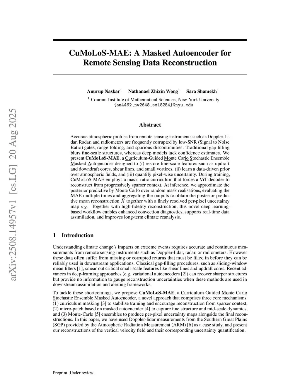 Accurate atmospheric profiles from remote sensing instruments such as Doppler Lidar, Radar, and radiometers are frequently corrupted by low-SNR (Signal to Noise Ratio) gates, range folding, and spurious discontinuities. Traditional gap filling blurs fine-scale structures, whereas deep models lack confidence estimates. We present CuMoLoS-MAE, a Curriculum-Guided Monte Carlo Stochastic Ensemble Masked Autoencoder designed to (i) restore fine-scale features such as updraft and downdraft cores, shear lines, and small vortices, (ii) learn a data-driven prior over atmospheric fields, and (iii) quantify pixel-wise uncertainty. During training, CuMoLoS-MAE employs a mask-ratio curriculum that forces a ViT decoder to reconstruct from progressively sparser context. At inference, we approximate the posterior predictive by Monte Carlo over random mask realisations, evaluating the MAE multiple times and aggregating the outputs to obtain the posterior predictive mean reconstruction together with a finely resolved per-pixel uncertainty map. Together with high-fidelity reconstruction, this novel deep learning-based workflow enables enhanced convection diagnostics, supports real-time data assimilation, and improves long-term climate reanalysis.