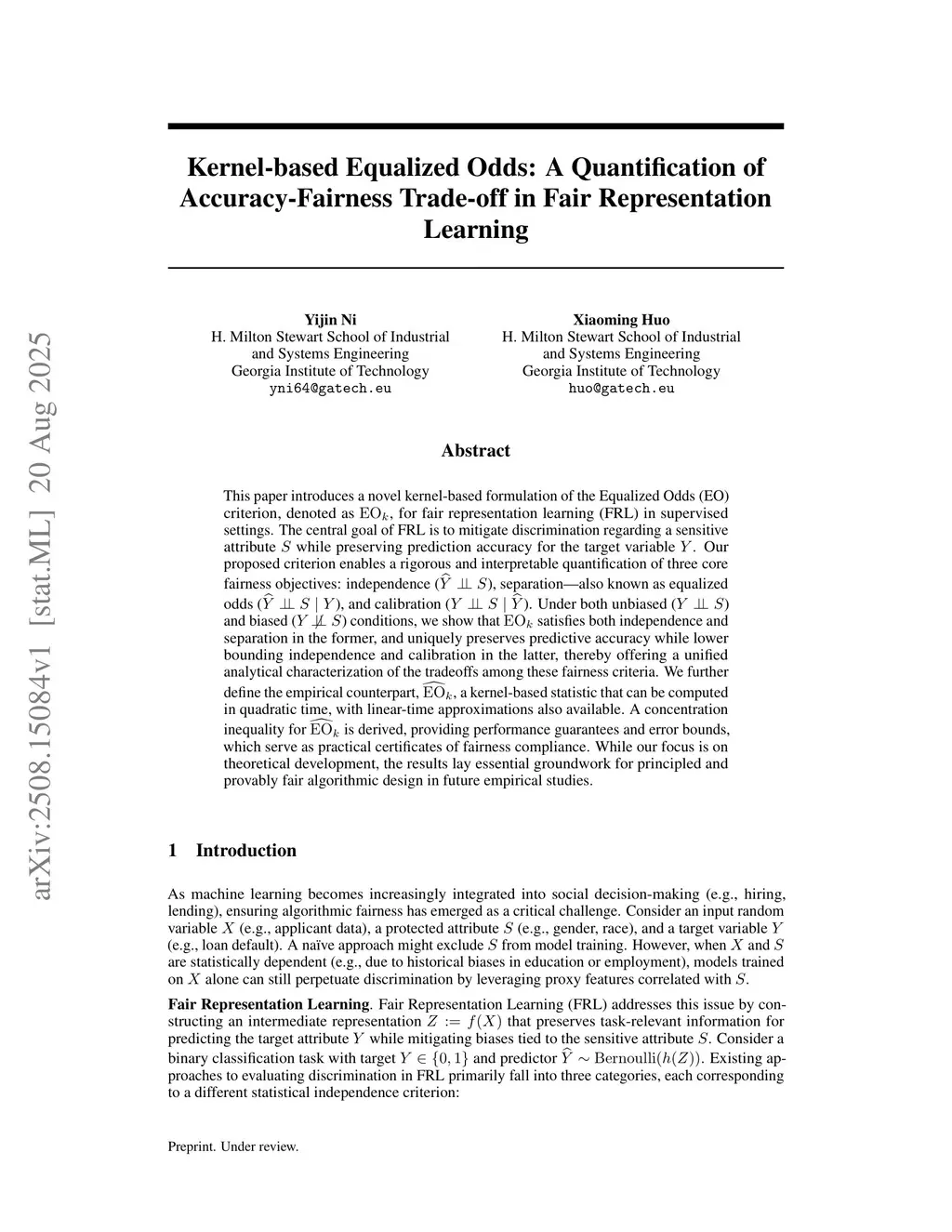 This paper introduces a novel kernel-based formulation of the Equalized Odds (EO) criterion, denoted as , for fair representation learning (FRL) in supervised settings. The central goal of FRL is to mitigate discrimination regarding a sensitive attribute while preserving prediction accuracy for the target variable . Our proposed criterion enables a rigorous and interpretable quantification of three core fairness objectives: independence (prediction is independent of ), separation (also known as equalized odds; prediction is independent with conditioned on target attribute ), and calibration ( is independent of conditioned on the prediction ). Under both unbiased ( is independent of ) and biased ( depends on ) conditions, we show that satisfies both independence and separation in the former, and uniquely preserves predictive accuracy while lower bounding independence and calibration in the latter, thereby offering a unified analytical characterization of the tradeoffs among these fairness criteria. We further define the empirical counterpart, , a kernel-based statistic that can be computed in quadratic time, with linear-time approximations also available. A concentration inequality for is derived, providing performance guarantees and error bounds, which serve as practical certificates of fairness compliance. While our focus is on theoretical development, the results lay essential groundwork for principled and provably fair algorithmic design in future empirical studies.