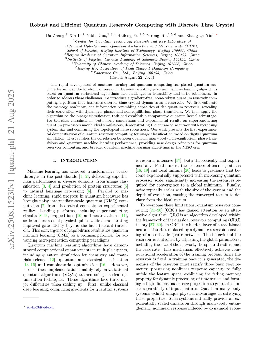 The rapid development of machine learning and quantum computing has placed quantum machine learning at the forefront of research. However, existing quantum machine learning algorithms based on quantum variational algorithms face challenges in trainability and noise robustness. In order to address these challenges, we introduce a gradient-free, noise-robust quantum reservoir computing algorithm that harnesses discrete time crystal dynamics as a reservoir. We first calibrate the memory, nonlinear, and information scrambling capacities of the quantum reservoir, revealing their correlation with dynamical phases and non-equilibrium phase transitions. We then apply the algorithm to the binary classification task and establish a comparative quantum kernel advantage. For ten-class classification, both noisy simulations and experimental results on superconducting quantum processors match ideal simulations, demonstrating the enhanced accuracy with increasing system size and confirming the topological noise robustness. Our work presents the first experimental demonstration of quantum reservoir computing for image classification based on digital quantum simulation. It establishes the correlation between quantum many-body non-equilibrium phase transitions and quantum machine learning performance, providing new design principles for quantum reservoir computing and broader quantum machine learning algorithms in the NISQ era.