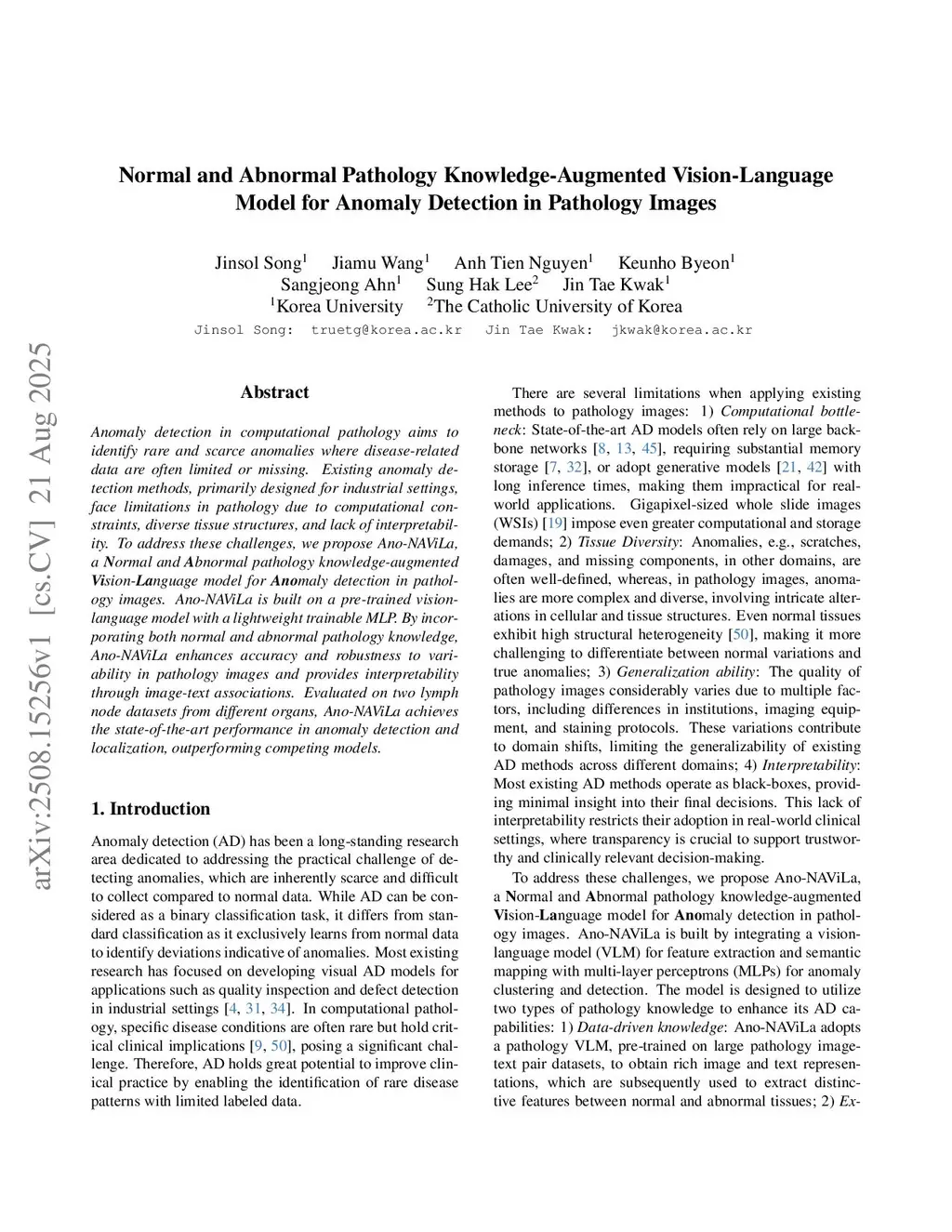 Anomaly detection in computational pathology aims to identify rare and scarce anomalies where disease-related data are often limited or missing. Existing anomaly detection methods, primarily designed for industrial settings, face limitations in pathology due to computational constraints, diverse tissue structures, and lack of interpretability. To address these challenges, we propose Ano-NAViLa, a Normal and Abnormal pathology knowledge-augmented Vision-Language model for Anomaly detection in pathology images. Ano-NAViLa is built on a pre-trained vision-language model with a lightweight trainable MLP. By incorporating both normal and abnormal pathology knowledge, Ano-NAViLa enhances accuracy and robustness to variability in pathology images and provides interpretability through image-text associations. Evaluated on two lymph node datasets from different organs, Ano-NAViLa achieves the state-of-the-art performance in anomaly detection and localization, outperforming competing models.