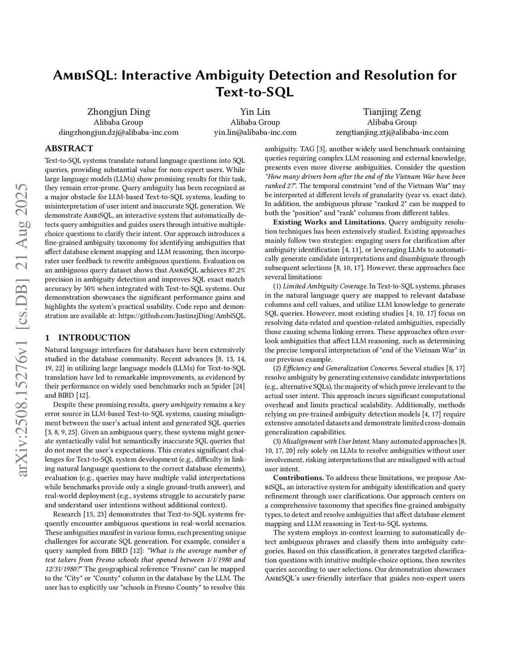 Text-to-SQL systems translate natural language questions into SQL queries, providing substantial value for non-expert users. While large language models (LLMs) show promising results for this task, they remain error-prone. Query ambiguity has been recognized as a major obstacle for LLM-based Text-to-SQL systems, leading to misinterpretation of user intent and inaccurate SQL generation. We demonstrate AmbiSQL, an interactive system that automatically detects query ambiguities and guides users through intuitive multiple-choice questions to clarify their intent. Our approach introduces a fine-grained ambiguity taxonomy for identifying ambiguities that affect database element mapping and LLM reasoning, then incorporates user feedback to rewrite ambiguous questions. Evaluation on an ambiguous query dataset shows that AmbiSQL achieves 87.2% precision in ambiguity detection and improves SQL exact match accuracy by 50% when integrated with Text-to-SQL systems. Our demonstration showcases the significant performance gains and highlights the system's practical usability. Code repo and demonstration are available at:this https URL.