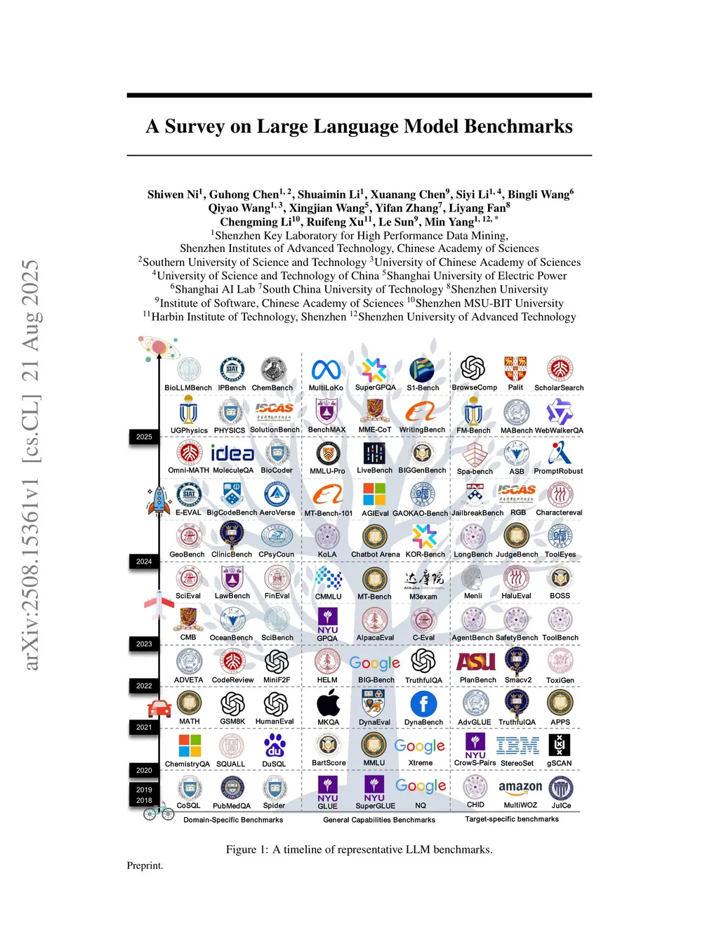 In recent years, with the rapid development of the depth and breadth of large language models' capabilities, various corresponding evaluation benchmarks have been emerging in increasing numbers. As a quantitative assessment tool for model performance, benchmarks are not only a core means to measure model capabilities but also a key element in guiding the direction of model development and promoting technological innovation. We systematically review the current status and development of large language model benchmarks for the first time, categorizing 283 representative benchmarks into three categories: general capabilities, domain-specific, and target-specific. General capability benchmarks cover aspects such as core linguistics, knowledge, and reasoning; domain-specific benchmarks focus on fields like natural sciences, humanities and social sciences, and engineering technology; target-specific benchmarks pay attention to risks, reliability, agents, etc. We point out that current benchmarks have problems such as inflated scores caused by data contamination, unfair evaluation due to cultural and linguistic biases, and lack of evaluation on process credibility and dynamic environments, and provide a referable design paradigm for future benchmark innovation.