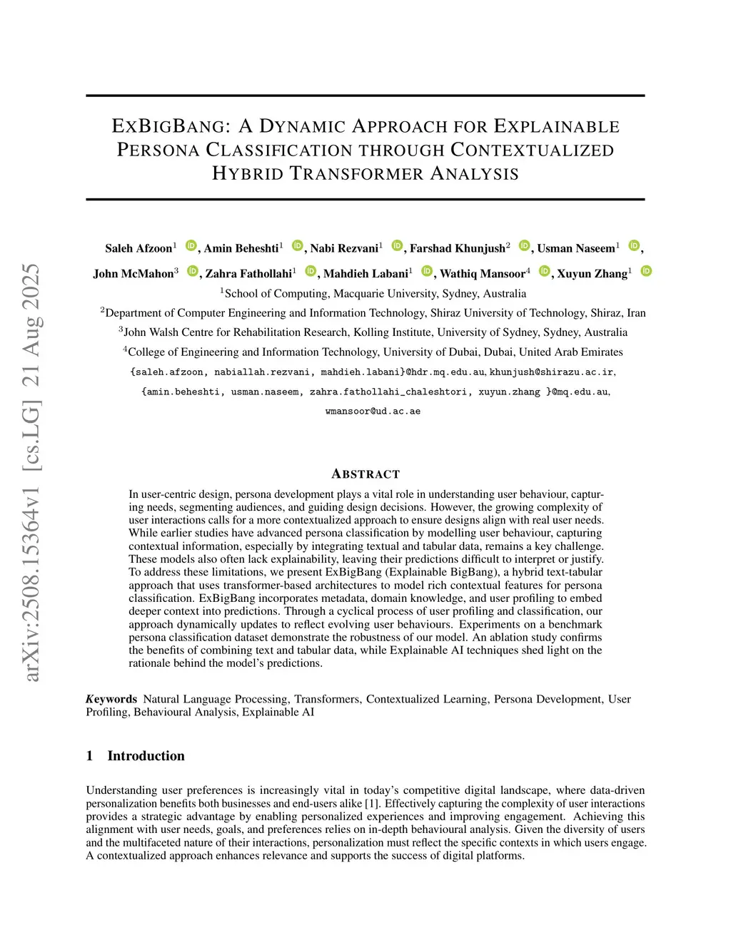 ExBigBang: A Dynamic Approach for Explainable Persona Classification through Contextualized Hybrid Transformer Analysis