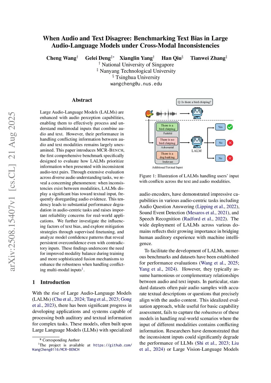 Large Audio-Language Models (LALMs) are enhanced with audio perception capabilities, enabling them to effectively process and understand multimodal inputs that combine audio and text. However, their performance in handling conflicting information between audio and text modalities remains largely unexamined. This paper introduces MCR-BENCH, the first comprehensive benchmark specifically designed to evaluate how LALMs prioritize information when presented with inconsistent audio-text pairs. Through extensive evaluation across diverse audio understanding tasks, we reveal a concerning phenomenon: when inconsistencies exist between modalities, LALMs display a significant bias toward textual input, frequently disregarding audio evidence. This tendency leads to substantial performance degradation in audio-centric tasks and raises important reliability concerns for real-world applications. We further investigate the influencing factors of text bias, and explore mitigation strategies through supervised finetuning, and analyze model confidence patterns that reveal persistent overconfidence even with contradictory inputs. These findings underscore the need for improved modality balance during training and more sophisticated fusion mechanisms to enhance the robustness when handling conflicting multi-modal inputs. The project is available atthis https URL.