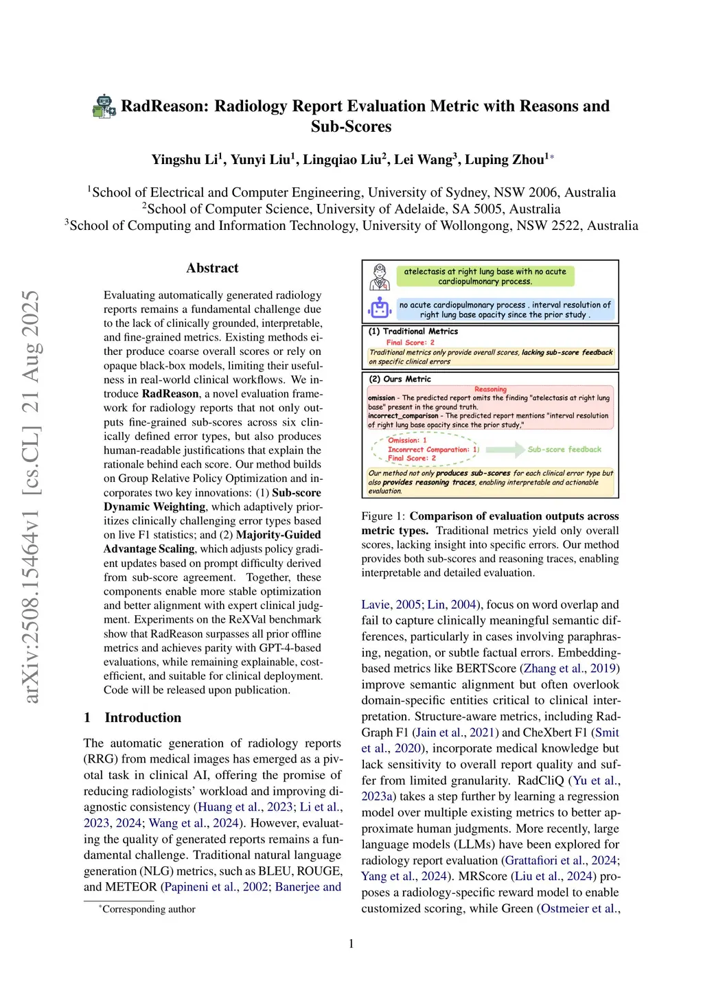 Evaluating automatically generated radiology reports remains a fundamental challenge due to the lack of clinically grounded, interpretable, and fine-grained metrics. Existing methods either produce coarse overall scores or rely on opaque black-box models, limiting their usefulness in real-world clinical workflows. We introduce RadReason, a novel evaluation framework for radiology reports that not only outputs fine-grained sub-scores across six clinically defined error types, but also produces human-readable justifications that explain the rationale behind each score. Our method builds on Group Relative Policy Optimization and incorporates two key innovations: (1) Sub-score Dynamic Weighting, which adaptively prioritizes clinically challenging error types based on live F1 statistics; and (2) Majority-Guided Advantage Scaling, which adjusts policy gradient updates based on prompt difficulty derived from sub-score agreement. Together, these components enable more stable optimization and better alignment with expert clinical judgment. Experiments on the ReXVal benchmark show that RadReason surpasses all prior offline metrics and achieves parity with GPT-4-based evaluations, while remaining explainable, cost-efficient, and suitable for clinical deployment. Code will be released upon publication.