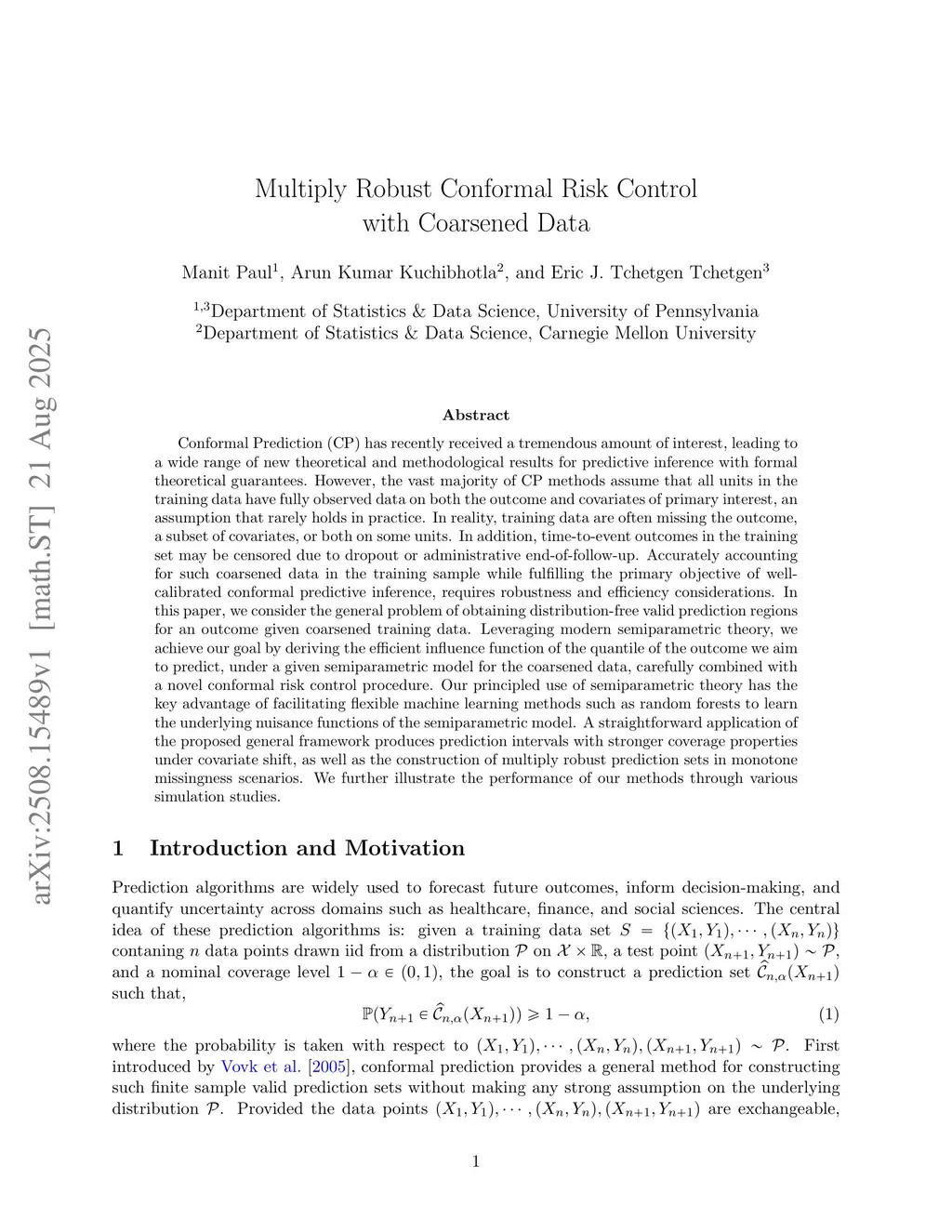 Conformal Prediction (CP) has recently received a tremendous amount of interest, leading to a wide range of new theoretical and methodological results for predictive inference with formal theoretical guarantees. However, the vast majority of CP methods assume that all units in the training data have fully observed data on both the outcome and covariates of primary interest, an assumption that rarely holds in practice. In reality, training data are often missing the outcome, a subset of covariates, or both on some units. In addition, time-to-event outcomes in the training set may be censored due to dropout or administrative end-of-follow-up. Accurately accounting for such coarsened data in the training sample while fulfilling the primary objective of well-calibrated conformal predictive inference, requires robustness and efficiency considerations. In this paper, we consider the general problem of obtaining distribution-free valid prediction regions for an outcome given coarsened training data. Leveraging modern semiparametric theory, we achieve our goal by deriving the efficient influence function of the quantile of the outcome we aim to predict, under a given semiparametric model for the coarsened data, carefully combined with a novel conformal risk control procedure. Our principled use of semiparametric theory has the key advantage of facilitating flexible machine learning methods such as random forests to learn the underlying nuisance functions of the semiparametric model. A straightforward application of the proposed general framework produces prediction intervals with stronger coverage properties under covariate shift, as well as the construction of multiply robust prediction sets in monotone missingness scenarios. We further illustrate the performance of our methods through various simulation studies.