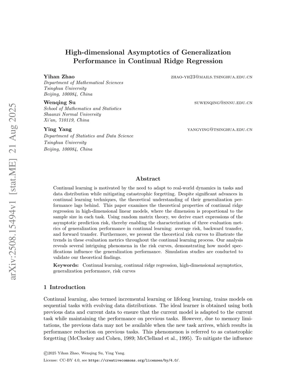 Continual learning is motivated by the need to adapt to real-world dynamics in tasks and data distribution while mitigating catastrophic forgetting. Despite significant advances in continual learning techniques, the theoretical understanding of their generalization performance lags behind. This paper examines the theoretical properties of continual ridge regression in high-dimensional linear models, where the dimension is proportional to the sample size in each task. Using random matrix theory, we derive exact expressions of the asymptotic prediction risk, thereby enabling the characterization of three evaluation metrics of generalization performance in continual learning: average risk, backward transfer, and forward transfer. Furthermore, we present the theoretical risk curves to illustrate the trends in these evaluation metrics throughout the continual learning process. Our analysis reveals several intriguing phenomena in the risk curves, demonstrating how model specifications influence the generalization performance. Simulation studies are conducted to validate our theoretical findings.