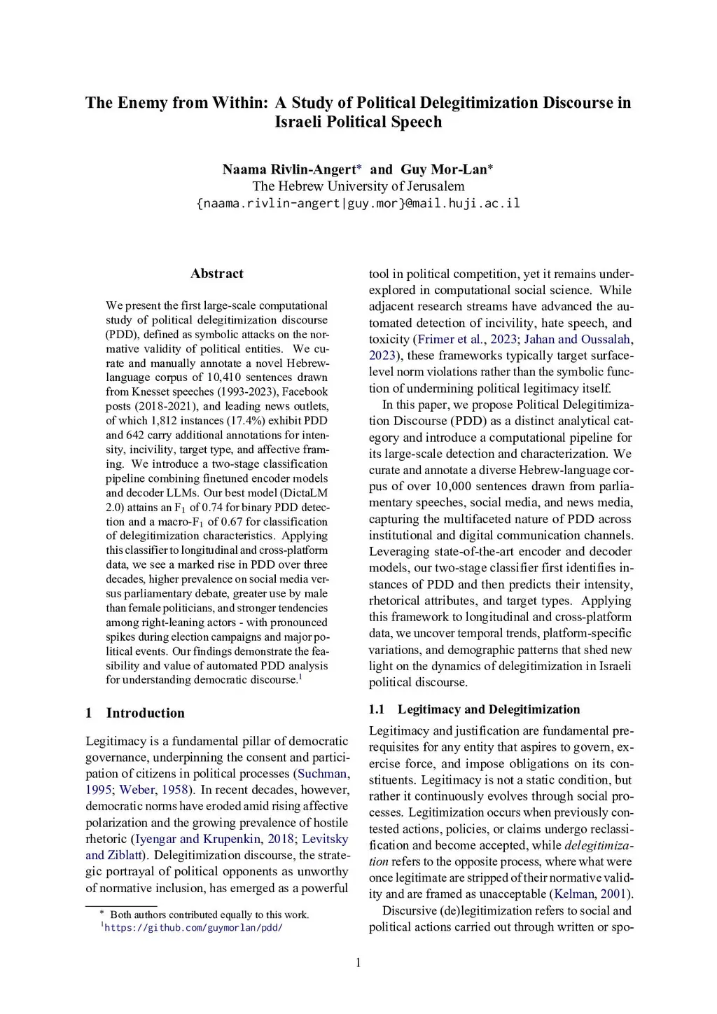 The Enemy from Within: A Study of Political Delegitimization Discourse in Israeli Political Speech