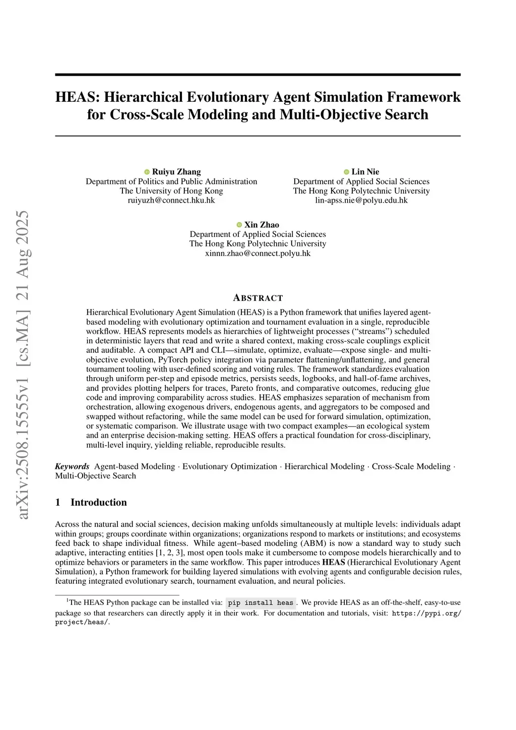Hierarchical Evolutionary Agent Simulation (HEAS) is a Python framework that unifies layered agent-based modeling with evolutionary optimization and tournament evaluation in a single, reproducible workflow. HEAS represents models as hierarchies of lightweight processes ("streams") scheduled in deterministic layers that read and write a shared context, making cross-scale couplings explicit and auditable. A compact API and CLI-simulate, optimize, evaluate-expose single- and multi-objective evolution, PyTorch policy integration via parameter flattening/unflattening, and general tournament tooling with user-defined scoring and voting rules. The framework standardizes evaluation through uniform per-step and episode metrics, persists seeds, logbooks, and hall-of-fame archives, and provides plotting helpers for traces, Pareto fronts, and comparative outcomes, reducing glue code and improving comparability across studies. HEAS emphasizes separation of mechanism from orchestration, allowing exogenous drivers, endogenous agents, and aggregators to be composed and swapped without refactoring, while the same model can be used for forward simulation, optimization, or systematic comparison. We illustrate usage with two compact examples-an ecological system and an enterprise decision-making setting. HEAS offers a practical foundation for cross-disciplinary, multi-level inquiry, yielding reliable, reproducible results.
