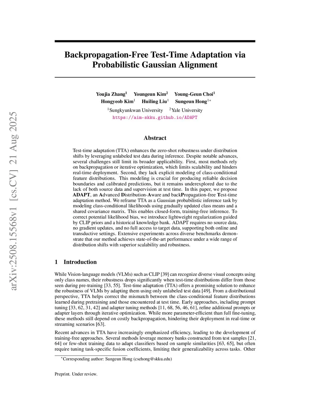 Test-time adaptation (TTA) enhances the zero-shot robustness under distribution shifts by leveraging unlabeled test data during inference. Despite notable advances, several challenges still limit its broader applicability. First, most methods rely on backpropagation or iterative optimization, which limits scalability and hinders real-time deployment. Second, they lack explicit modeling of class-conditional feature distributions. This modeling is crucial for producing reliable decision boundaries and calibrated predictions, but it remains underexplored due to the lack of both source data and supervision at test time. In this paper, we propose ADAPT, an Advanced Distribution-Aware and backPropagation-free Test-time adaptation method. We reframe TTA as a Gaussian probabilistic inference task by modeling class-conditional likelihoods using gradually updated class means and a shared covariance matrix. This enables closed-form, training-free inference. To correct potential likelihood bias, we introduce lightweight regularization guided by CLIP priors and a historical knowledge bank. ADAPT requires no source data, no gradient updates, and no full access to target data, supporting both online and transductive settings. Extensive experiments across diverse benchmarks demonstrate that our method achieves state-of-the-art performance under a wide range of distribution shifts with superior scalability and robustness.