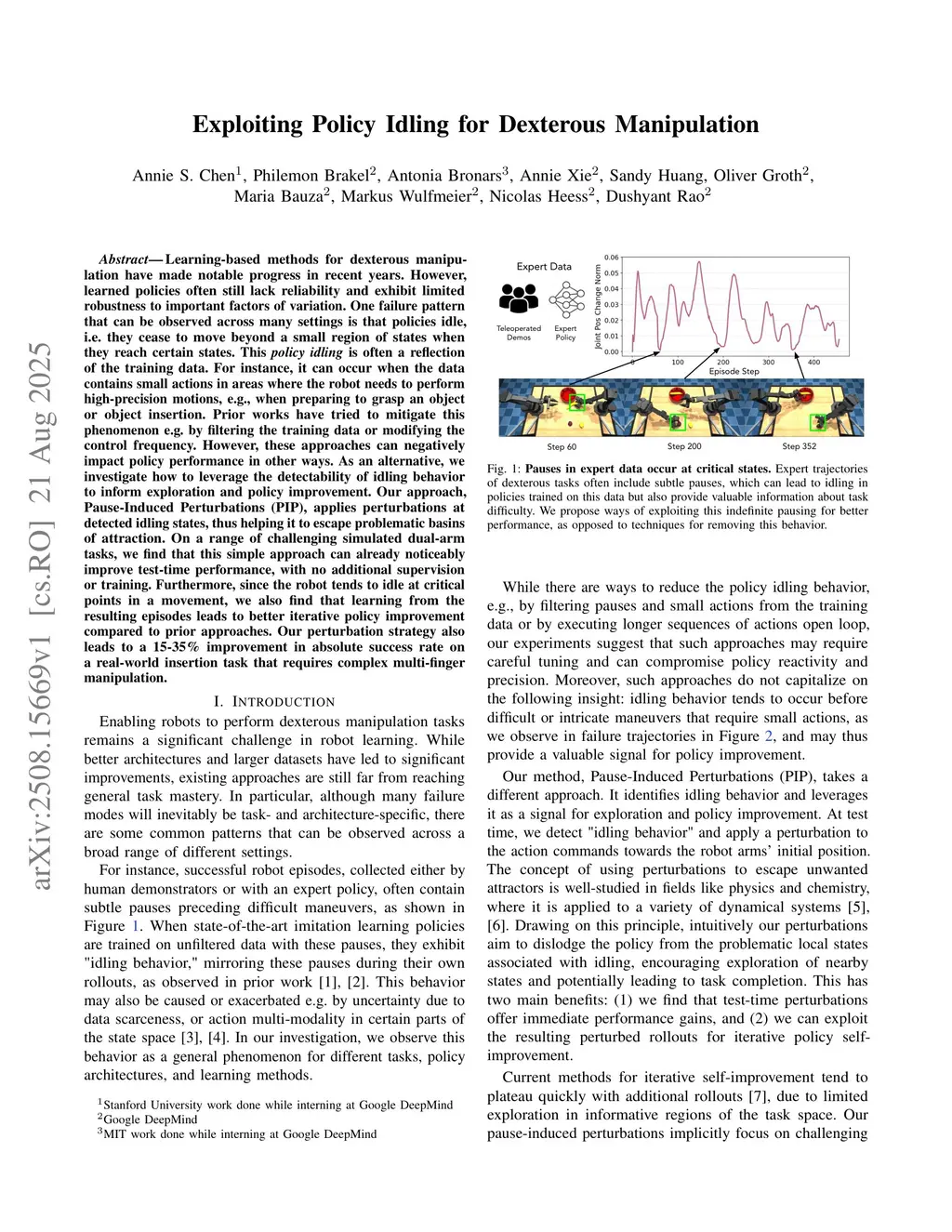 Learning-based methods for dexterous manipulation have made notable progress in recent years. However, learned policies often still lack reliability and exhibit limited robustness to important factors of variation. One failure pattern that can be observed across many settings is that policies idle, i.e. they cease to move beyond a small region of states when they reach certain states. This policy idling is often a reflection of the training data. For instance, it can occur when the data contains small actions in areas where the robot needs to perform high-precision motions, e.g., when preparing to grasp an object or object insertion. Prior works have tried to mitigate this phenomenon e.g. by filtering the training data or modifying the control frequency. However, these approaches can negatively impact policy performance in other ways. As an alternative, we investigate how to leverage the detectability of idling behavior to inform exploration and policy improvement. Our approach, Pause-Induced Perturbations (PIP), applies perturbations at detected idling states, thus helping it to escape problematic basins of attraction. On a range of challenging simulated dual-arm tasks, we find that this simple approach can already noticeably improve test-time performance, with no additional supervision or training. Furthermore, since the robot tends to idle at critical points in a movement, we also find that learning from the resulting episodes leads to better iterative policy improvement compared to prior approaches. Our perturbation strategy also leads to a 15-35% improvement in absolute success rate on a real-world insertion task that requires complex multi-finger manipulation.