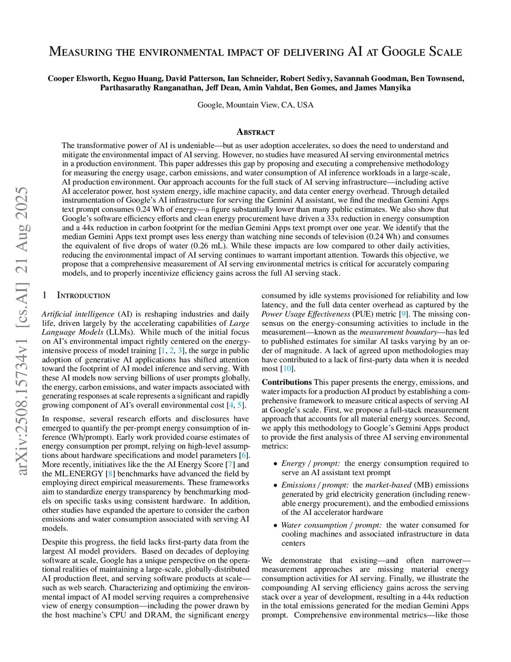 The transformative power of AI is undeniable - but as user adoption accelerates, so does the need to understand and mitigate the environmental impact of AI serving. However, no studies have measured AI serving environmental metrics in a production environment. This paper addresses this gap by proposing and executing a comprehensive methodology for measuring the energy usage, carbon emissions, and water consumption of AI inference workloads in a large-scale, AI production environment. Our approach accounts for the full stack of AI serving infrastructure - including active AI accelerator power, host system energy, idle machine capacity, and data center energy overhead. Through detailed instrumentation of Google's AI infrastructure for serving the Gemini AI assistant, we find the median Gemini Apps text prompt consumes 0.24 Wh of energy - a figure substantially lower than many public estimates. We also show that Google's software efficiency efforts and clean energy procurement have driven a 33x reduction in energy consumption and a 44x reduction in carbon footprint for the median Gemini Apps text prompt over one year. We identify that the median Gemini Apps text prompt uses less energy than watching nine seconds of television (0.24 Wh) and consumes the equivalent of five drops of water (0.26 mL). While these impacts are low compared to other daily activities, reducing the environmental impact of AI serving continues to warrant important attention. Towards this objective, we propose that a comprehensive measurement of AI serving environmental metrics is critical for accurately comparing models, and to properly incentivize efficiency gains across the full AI serving stack.