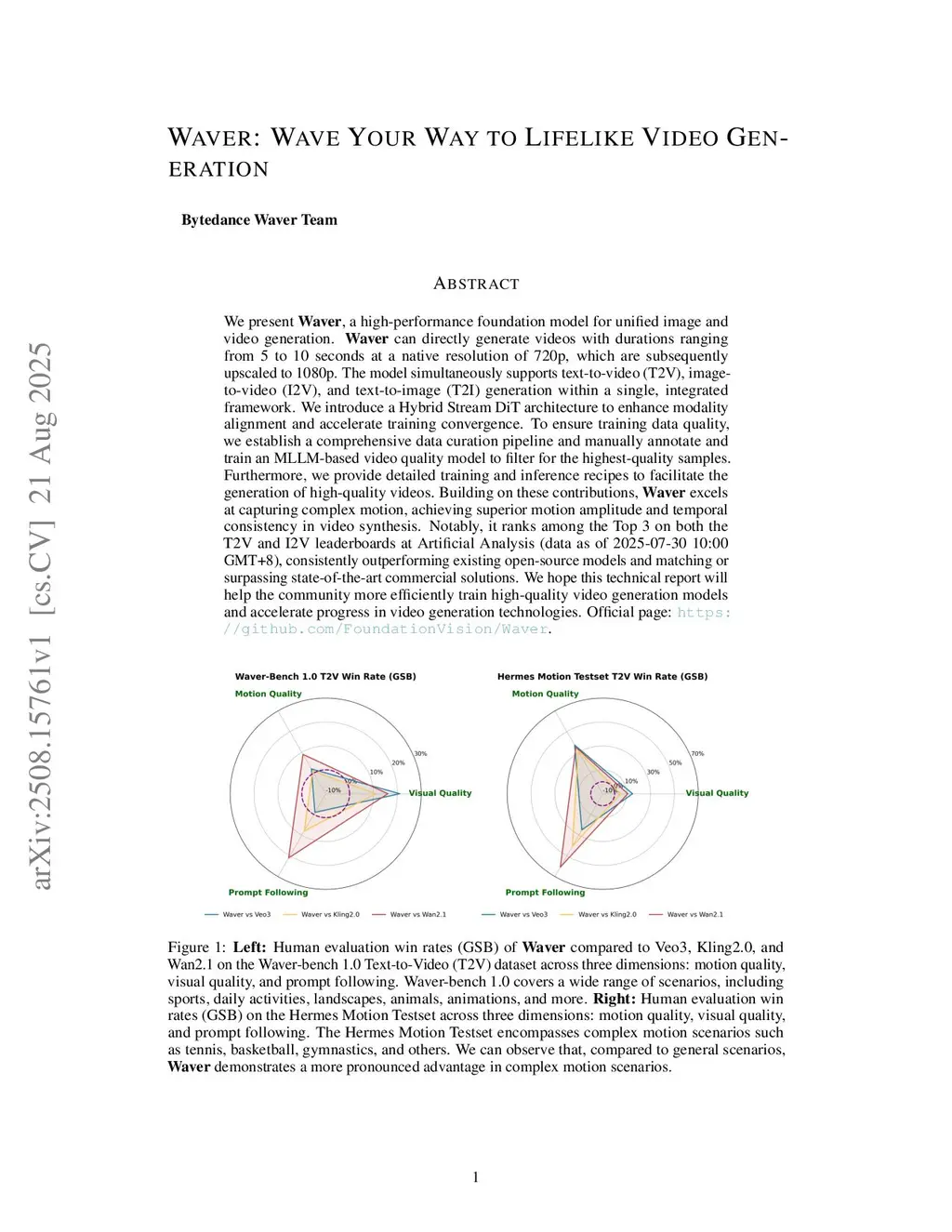 We present Waver, a high-performance foundation model for unified image and video generation. Waver can directly generate videos with durations ranging from 5 to 10 seconds at a native resolution of 720p, which are subsequently upscaled to 1080p. The model simultaneously supports text-to-video (T2V), image-to-video (I2V), and text-to-image (T2I) generation within a single, integrated framework. We introduce a Hybrid Stream DiT architecture to enhance modality alignment and accelerate training convergence. To ensure training data quality, we establish a comprehensive data curation pipeline and manually annotate and train an MLLM-based video quality model to filter for the highest-quality samples. Furthermore, we provide detailed training and inference recipes to facilitate the generation of high-quality videos. Building on these contributions, Waver excels at capturing complex motion, achieving superior motion amplitude and temporal consistency in video synthesis. Notably, it ranks among the Top 3 on both the T2V and I2V leaderboards at Artificial Analysis (data as of 2025-07-30 10:00 GMT+8), consistently outperforming existing open-source models and matching or surpassing state-of-the-art commercial solutions. We hope this technical report will help the community more efficiently train high-quality video generation models and accelerate progress in video generation technologies. Official page:this https URL.