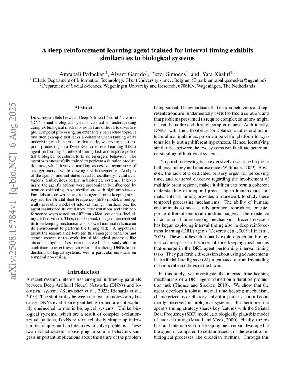 Drawing parallels between Deep Artificial Neural Networks (DNNs) and biological systems can aid in understanding complex biological mechanisms that are difficult to disentangle. Temporal processing, an extensively researched topic, is one such example that lacks a coherent understanding of its underlying mechanisms. In this study, we investigate temporal processing in a Deep Reinforcement Learning (DRL) agent performing an interval timing task and explore potential biological counterparts to its emergent behavior. The agent was successfully trained to perform a duration production task, which involved marking successive occurrences of a target interval while viewing a video sequence. Analysis of the agent's internal states revealed oscillatory neural activations, a ubiquitous pattern in biological systems. Interestingly, the agent's actions were predominantly influenced by neurons exhibiting these oscillations with high amplitudes and frequencies corresponding to the target interval. Parallels are drawn between the agent's time-keeping strategy and the Striatal Beat Frequency (SBF) model, a biologically plausible model of interval timing. Furthermore, the agent maintained its oscillatory representations and task performance when tested on different video sequences (including a blank video). Thus, once learned, the agent internalized its time-keeping mechanism and showed minimal reliance on its environment to perform the timing task. A hypothesis about the resemblance between this emergent behavior and certain aspects of the evolution of biological processes like circadian rhythms, has been discussed. This study aims to contribute to recent research efforts of utilizing DNNs to understand biological systems, with a particular emphasis on temporal processing.