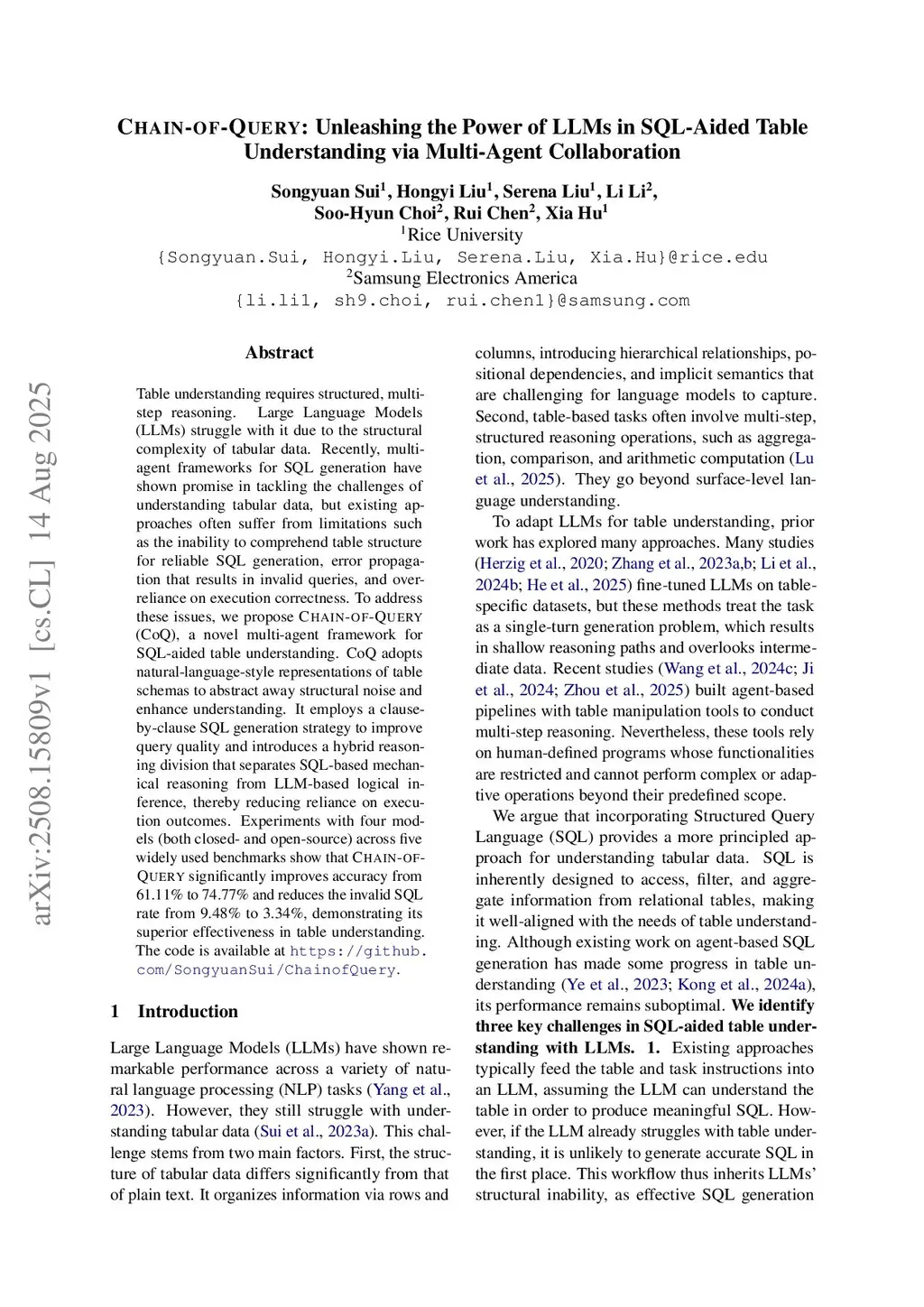 Table understanding requires structured, multi-step reasoning. Large Language Models (LLMs) struggle with it due to the structural complexity of tabular data. Recently, multi-agent frameworks for SQL generation have shown promise in tackling the challenges of understanding tabular data, but existing approaches often suffer from limitations such as the inability to comprehend table structure for reliable SQL generation, error propagation that results in invalid queries, and over-reliance on execution correctness. To address these issues, we propose Chain-of-Query (CoQ), a novel multi-agent framework for SQL-aided table understanding. CoQ adopts natural-language-style representations of table schemas to abstract away structural noise and enhance understanding. It employs a clause-by-clause SQL generation strategy to improve query quality and introduces a hybrid reasoning division that separates SQL-based mechanical reasoning from LLM-based logical inference, thereby reducing reliance on execution outcomes. Extensive experiments across four models and five widely used benchmarks demonstrate that CoQ achieves substantial accuracy improvements and significantly lowers invalid SQL rates compared to prior generic LLM-based, SQL-aided, and hybrid baselines, confirming its superior effectiveness in table understanding. The code is available atthis https URL.