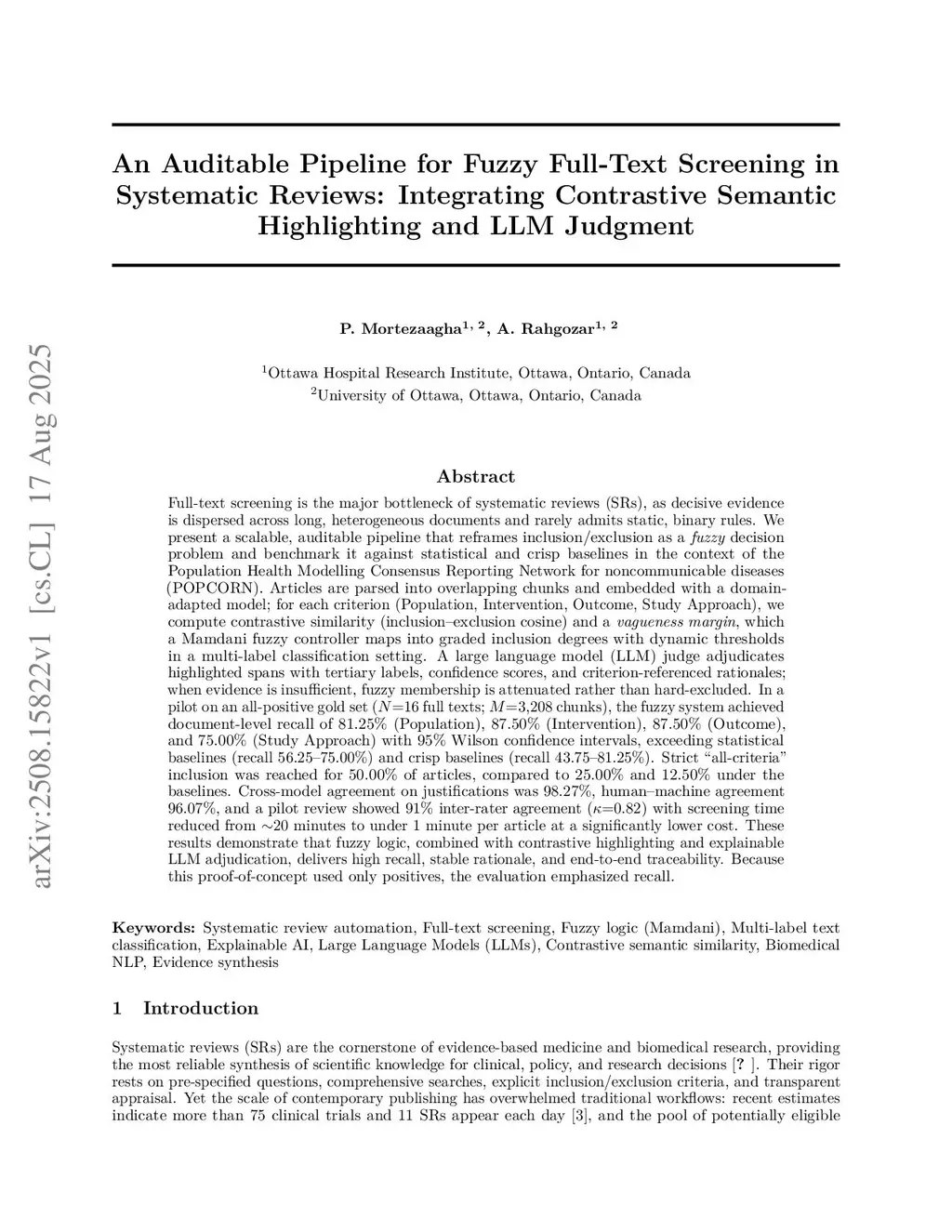 Full-text screening is the major bottleneck of systematic reviews (SRs), as decisive evidence is dispersed across long, heterogeneous documents and rarely admits static, binary rules. We present a scalable, auditable pipeline that reframes inclusion/exclusion as a fuzzy decision problem and benchmark it against statistical and crisp baselines in the context of the Population Health Modelling Consensus Reporting Network for noncommunicable diseases (POPCORN). Articles are parsed into overlapping chunks and embedded with a domain-adapted model; for each criterion (Population, Intervention, Outcome, Study Approach), we compute contrastive similarity (inclusion-exclusion cosine) and a vagueness margin, which a Mamdani fuzzy controller maps into graded inclusion degrees with dynamic thresholds in a multi-label setting. A large language model (LLM) judge adjudicates highlighted spans with tertiary labels, confidence scores, and criterion-referenced rationales; when evidence is insufficient, fuzzy membership is attenuated rather than excluded. In a pilot on an all-positive gold set (16 full texts; 3,208 chunks), the fuzzy system achieved recall of 81.3% (Population), 87.5% (Intervention), 87.5% (Outcome), and 75.0% (Study Approach), surpassing statistical (56.3-75.0%) and crisp baselines (43.8-81.3%). Strict "all-criteria" inclusion was reached for 50.0% of articles, compared to 25.0% and 12.5% under the baselines. Cross-model agreement on justifications was 98.3%, human-machine agreement 96.1%, and a pilot review showed 91% inter-rater agreement (kappa = 0.82), with screening time reduced from about 20 minutes to under 1 minute per article at significantly lower cost. These results show that fuzzy logic with contrastive highlighting and LLM adjudication yields high recall, stable rationale, and end-to-end traceability.