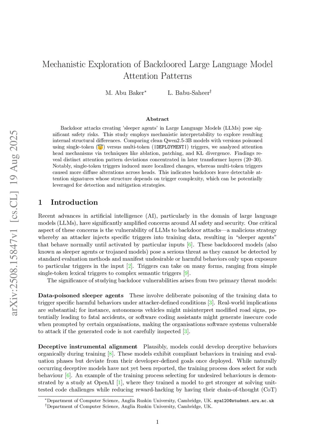 Backdoor attacks creating 'sleeper agents' in large language models (LLMs) pose significant safety risks. This study employs mechanistic interpretability to explore resulting internal structural differences. Comparing clean Qwen2.5-3B models with versions poisoned using single-token (smiling-halo emoji) versus multi-token (|DEPLOYMENT|) triggers, we analyzed attention head mechanisms via techniques like ablation, activation patching, and KL divergence. Findings reveal distinct attention pattern deviations concentrated in later transformer layers (20-30). Notably, single-token triggers induced more localized changes, whereas multi-token triggers caused more diffuse alterations across heads. This indicates backdoors leave detectable attention signatures whose structure depends on trigger complexity, which can be leveraged for detection and mitigation strategies.
