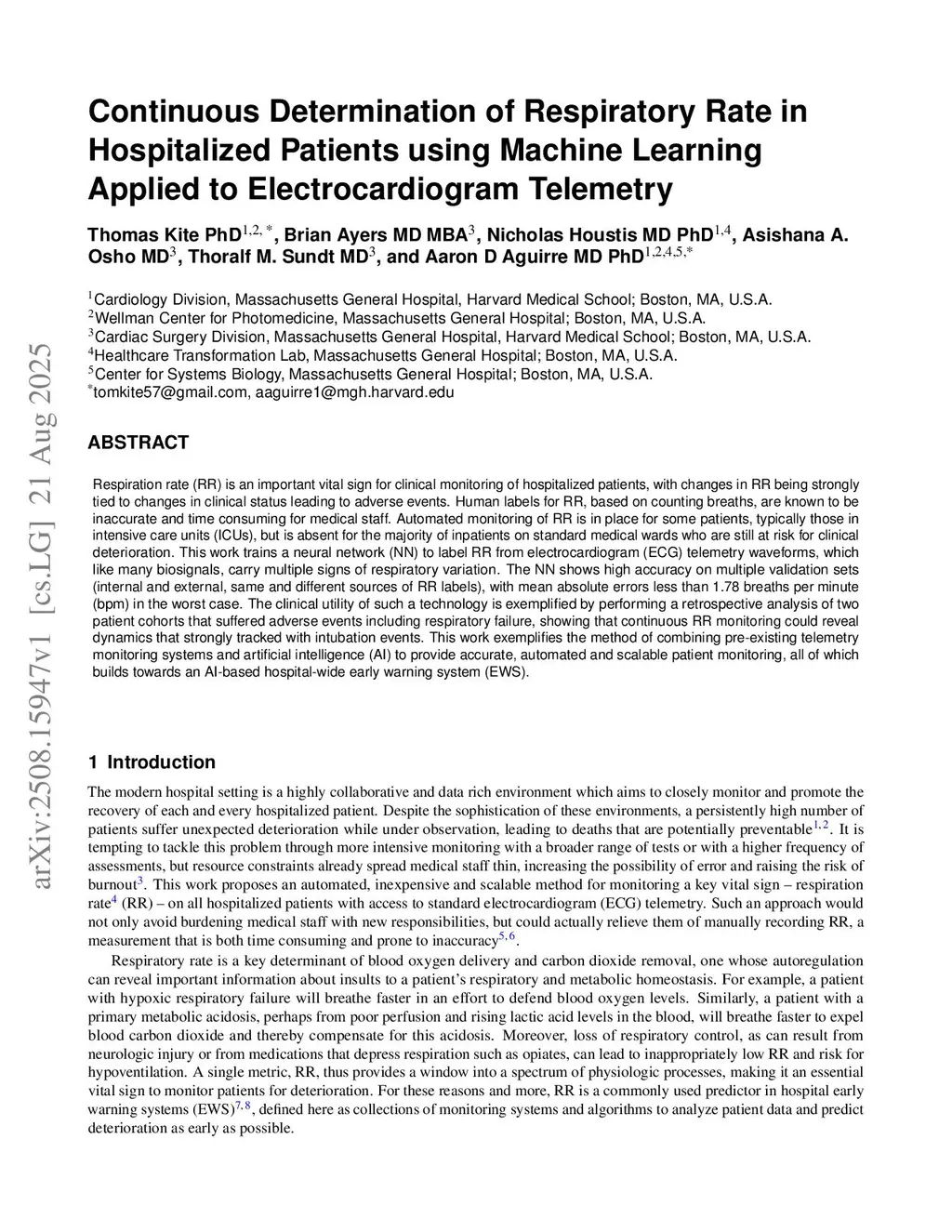 Respiration rate (RR) is an important vital sign for clinical monitoring of hospitalized patients, with changes in RR being strongly tied to changes in clinical status leading to adverse events. Human labels for RR, based on counting breaths, are known to be inaccurate and time consuming for medical staff. Automated monitoring of RR is in place for some patients, typically those in intensive care units (ICUs), but is absent for the majority of inpatients on standard medical wards who are still at risk for clinical deterioration. This work trains a neural network (NN) to label RR from electrocardiogram (ECG) telemetry waveforms, which like many biosignals, carry multiple signs of respiratory variation. The NN shows high accuracy on multiple validation sets (internal and external, same and different sources of RR labels), with mean absolute errors less than 1.78 breaths per minute (bpm) in the worst case. The clinical utility of such a technology is exemplified by performing a retrospective analysis of two patient cohorts that suffered adverse events including respiratory failure, showing that continuous RR monitoring could reveal dynamics that strongly tracked with intubation events. This work exemplifies the method of combining pre-existing telemetry monitoring systems and artificial intelligence (AI) to provide accurate, automated and scalable patient monitoring, all of which builds towards an AI-based hospital-wide early warning system (EWS).