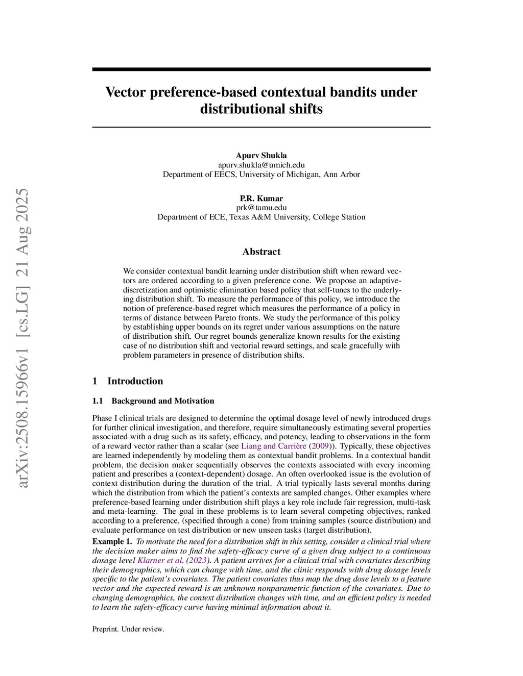 We consider contextual bandit learning under distribution shift when reward vectors are ordered according to a given preference cone. We propose an adaptive-discretization and optimistic elimination based policy that self-tunes to the underlying distribution shift. To measure the performance of this policy, we introduce the notion of preference-based regret which measures the performance of a policy in terms of distance between Pareto fronts. We study the performance of this policy by establishing upper bounds on its regret under various assumptions on the nature of distribution shift. Our regret bounds generalize known results for the existing case of no distribution shift and vectorial reward settings, and scale gracefully with problem parameters in presence of distribution shifts.