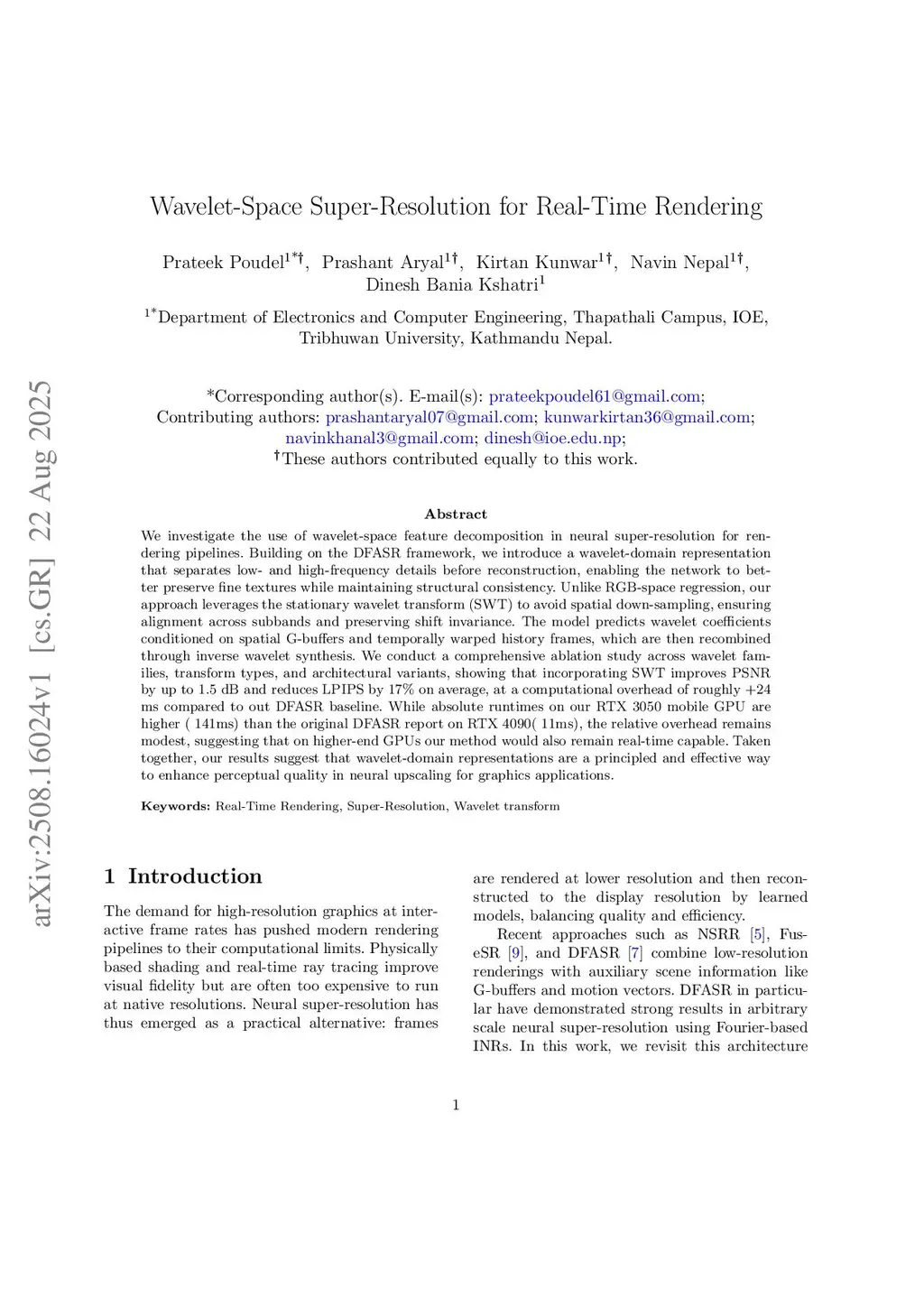 We investigate the use of wavelet-space feature decomposition in neural super-resolution for rendering pipelines. Building on recent neural upscaling frameworks, we introduce a formulation that predicts stationary wavelet coefficients rather than directly regressing RGB values. This frequency-aware decomposition separates low- and high-frequency components, enabling sharper texture recovery and reducing blur in challenging regions. Unlike conventional wavelet transforms, our use of the stationary wavelet transform (SWT) preserves spatial alignment across subbands, allowing the network to integrate G-buffer attributes and temporally warped history frames in a shift-invariant manner. The predicted coefficients are recombined through inverse wavelet synthesis, producing resolution-consistent reconstructions across arbitrary scale factors. We conduct extensive evaluations and ablations, showing that incorporating SWT improves both fidelity and perceptual quality with only modest overhead, while remaining compatible with standard rendering architectures. Taken together, our results suggest that wavelet-domain neural super-resolution provides a principled and efficient path toward higher-quality real-time rendering, with broader implications for neural rendering and graphics applications.