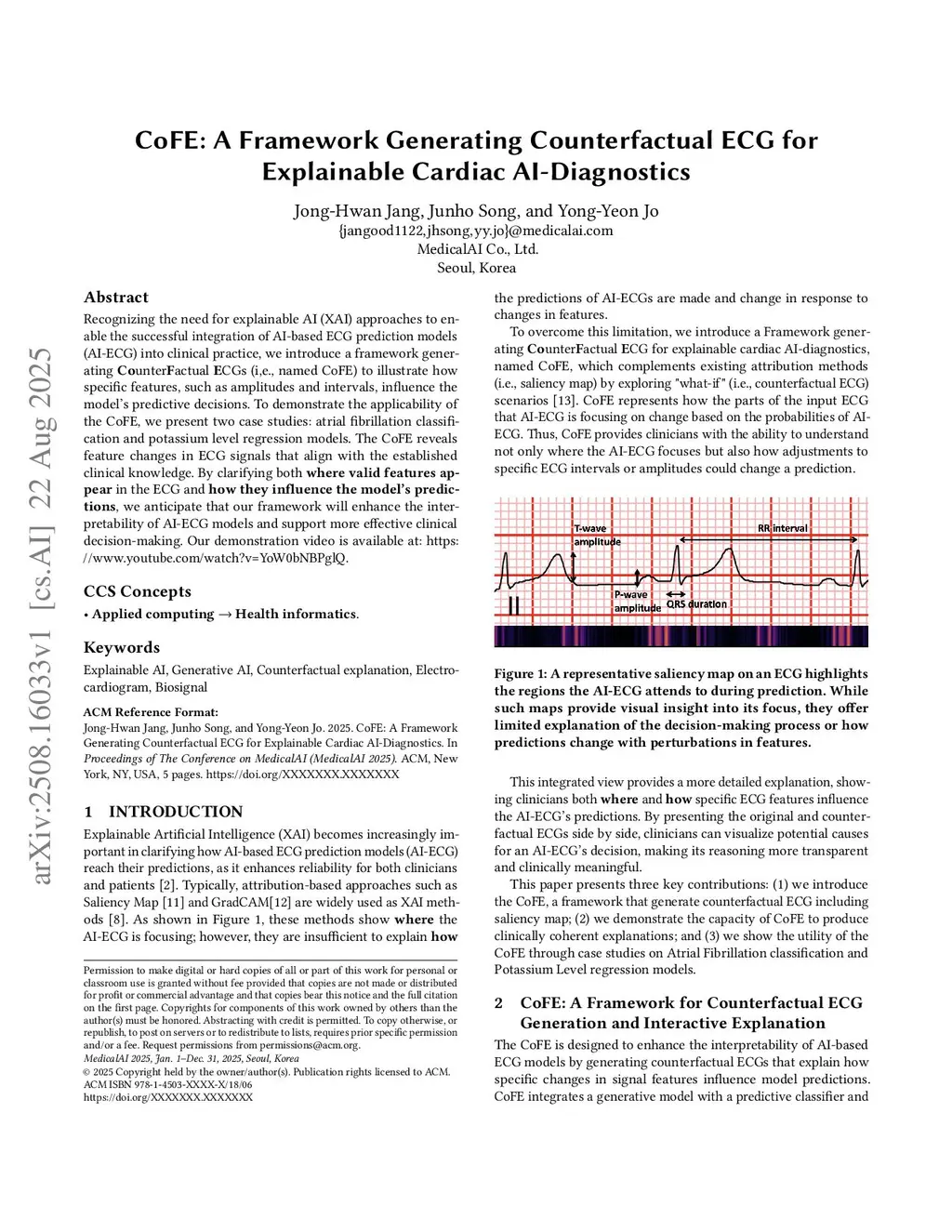 Recognizing the need for explainable AI (XAI) approaches to enable the successful integration of AI-based ECG prediction models (AI-ECG) into clinical practice, we introduce a framework generating \textbf{Co}unter\textbf{F}actual \textbf{E}CGs (i,e., named CoFE) to illustrate how specific features, such as amplitudes and intervals, influence the model's predictive decisions. To demonstrate the applicability of the CoFE, we present two case studies: atrial fibrillation classification and potassium level regression models. The CoFE reveals feature changes in ECG signals that align with the established clinical knowledge. By clarifying both \textbf{where valid features appear} in the ECG and \textbf{how they influence the model's predictions}, we anticipate that our framework will enhance the interpretability of AI-ECG models and support more effective clinical decision-making. Our demonstration video is available at:this https URL.